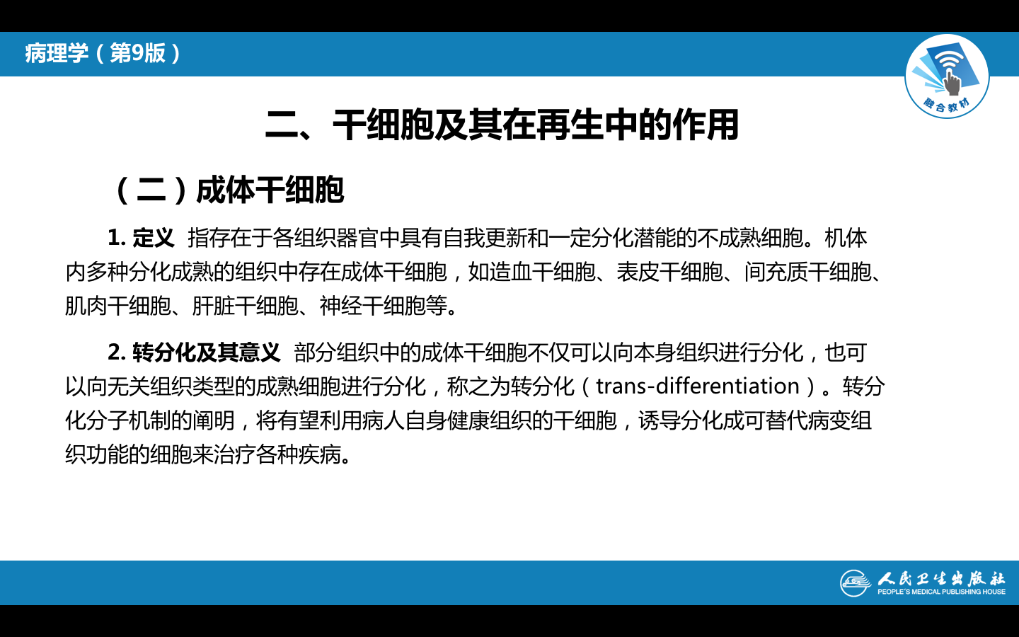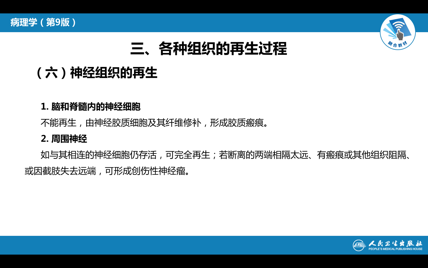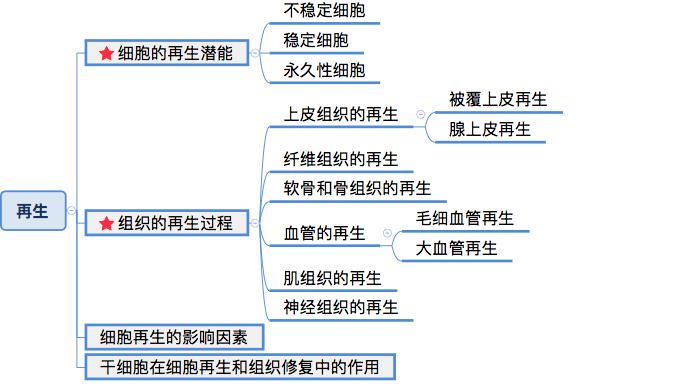 再生(regeneration)是指为修复缺损而发生的同种细胞的增生。说明:①再生是一种细胞的增生;②这种增生本质上是为了修复缺损,而不是为了吸收坏死物质或消除致炎因子(如局部增生的巨噬细胞等);③再生的细胞应是与缺损的实质细胞完全相同,再生分生理性再生和病理性再生。