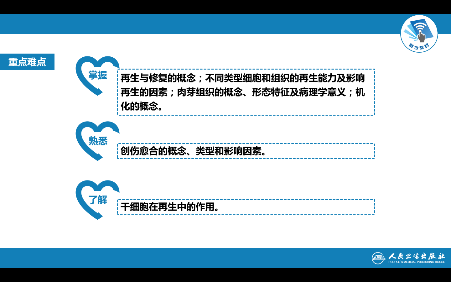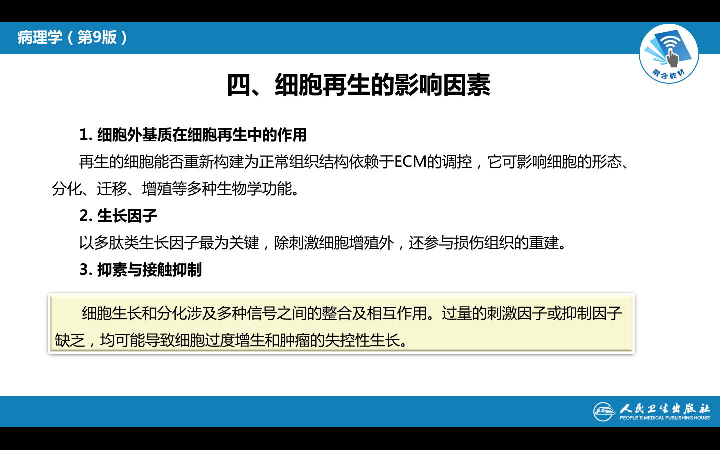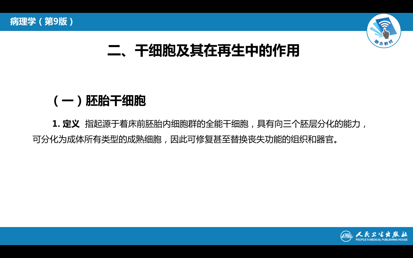 再生(regeneration)是指为修复缺损而发生的同种细胞的增生。说明:①再生是一种细胞的增生;②这种增生本质上是为了修复缺损,而不是为了吸收坏死物质或消除致炎因子(如局部增生的巨噬细胞等);③再生的细胞应是与缺损的实质细胞完全相同,再生分生理性再生和病理性再生。