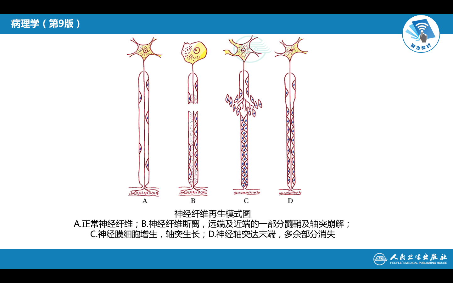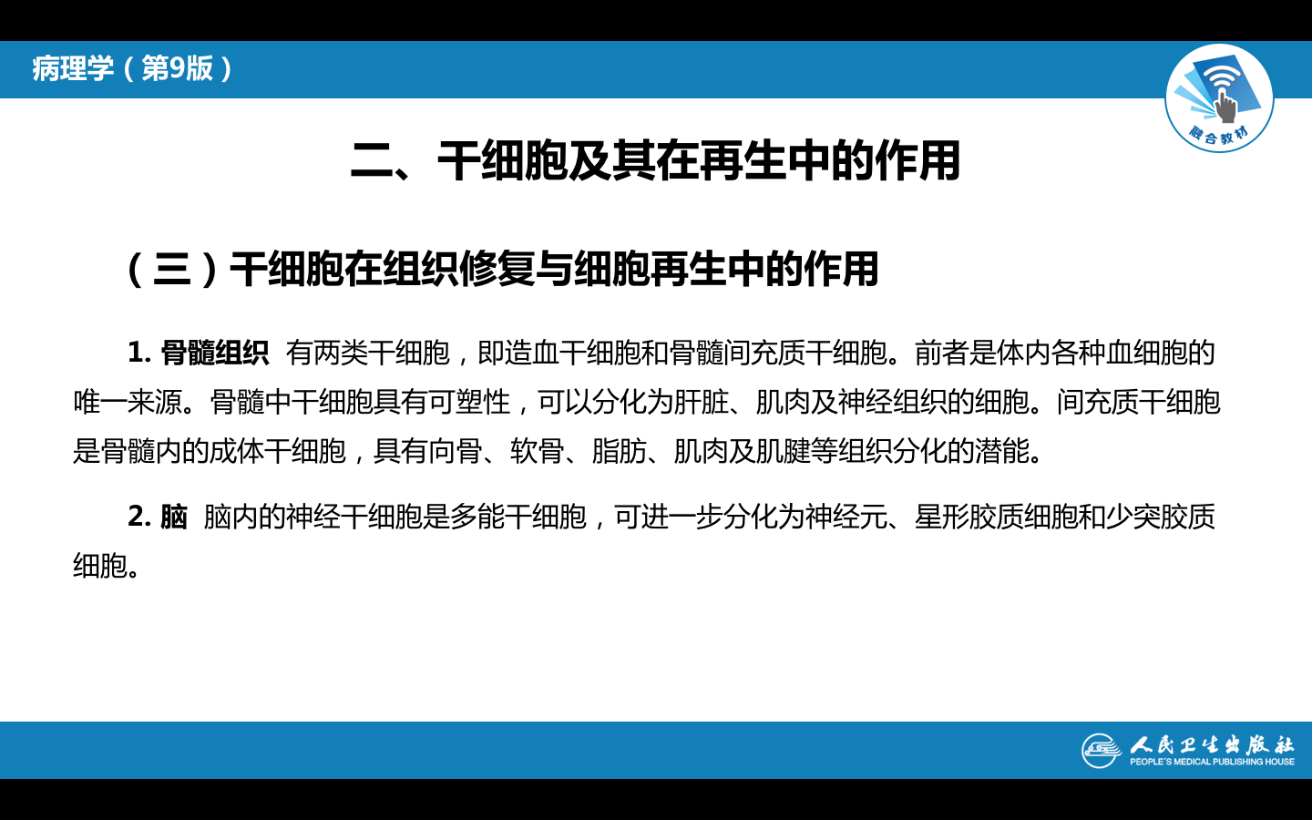 在病理状态下,细胞和组织坏死或缺损后,如果损伤程度较轻,损伤的细胞又有较强的再生能力,则可由损伤周围的同种细胞增生、分化,完全恢复原有的结构与功能,称为病理性再生。如表皮的Ⅱ度烫伤常出现水泡,基底细胞以上各层细胞坏死,此时基底细胞增生、分化,完全恢复表皮的原有结构与功能。在病理情况下,不能进行再生修复的组织,可经肉芽组织、瘢痕进行修复。