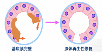 | B. 腺上皮 基底膜完整,可由残存的腺上皮细胞分裂补充。腺体结构完全破坏,难以再生。