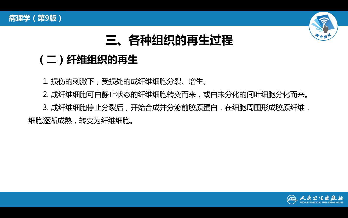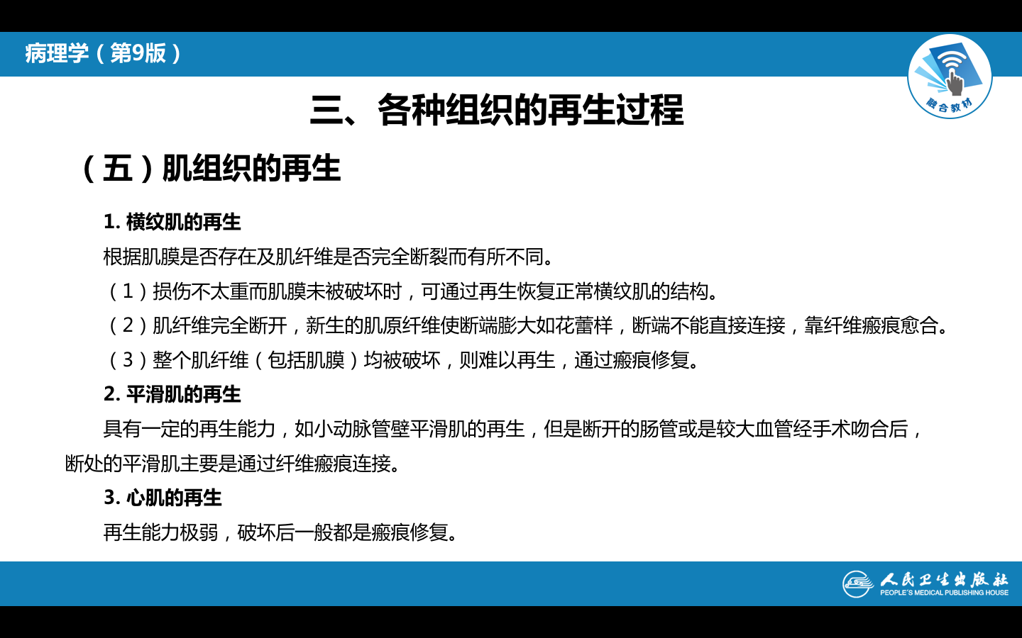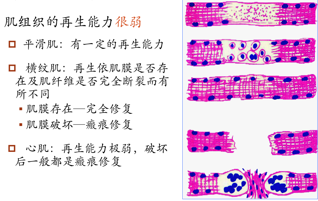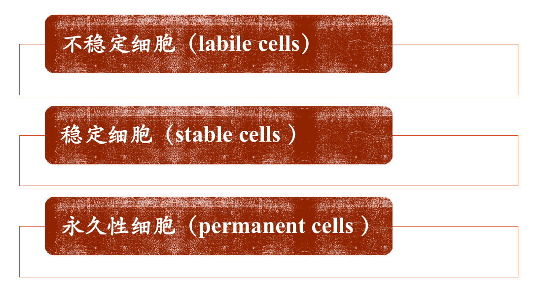 不同的组织,如上皮组织、纤维组织、血管、肌组织、神经组织等,根据本身的细胞再生能力、残存细胞数量、以及结缔组织网状支架是否存在决定了各自的再生过程。