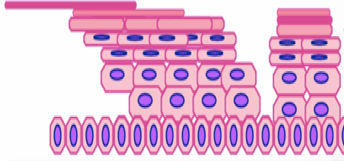 A. 被覆上皮 由邻近或创缘的基底部细胞分裂增生修补。新生细胞:立方形逐渐变为柱状;单层上皮逐渐变为鳞状上皮