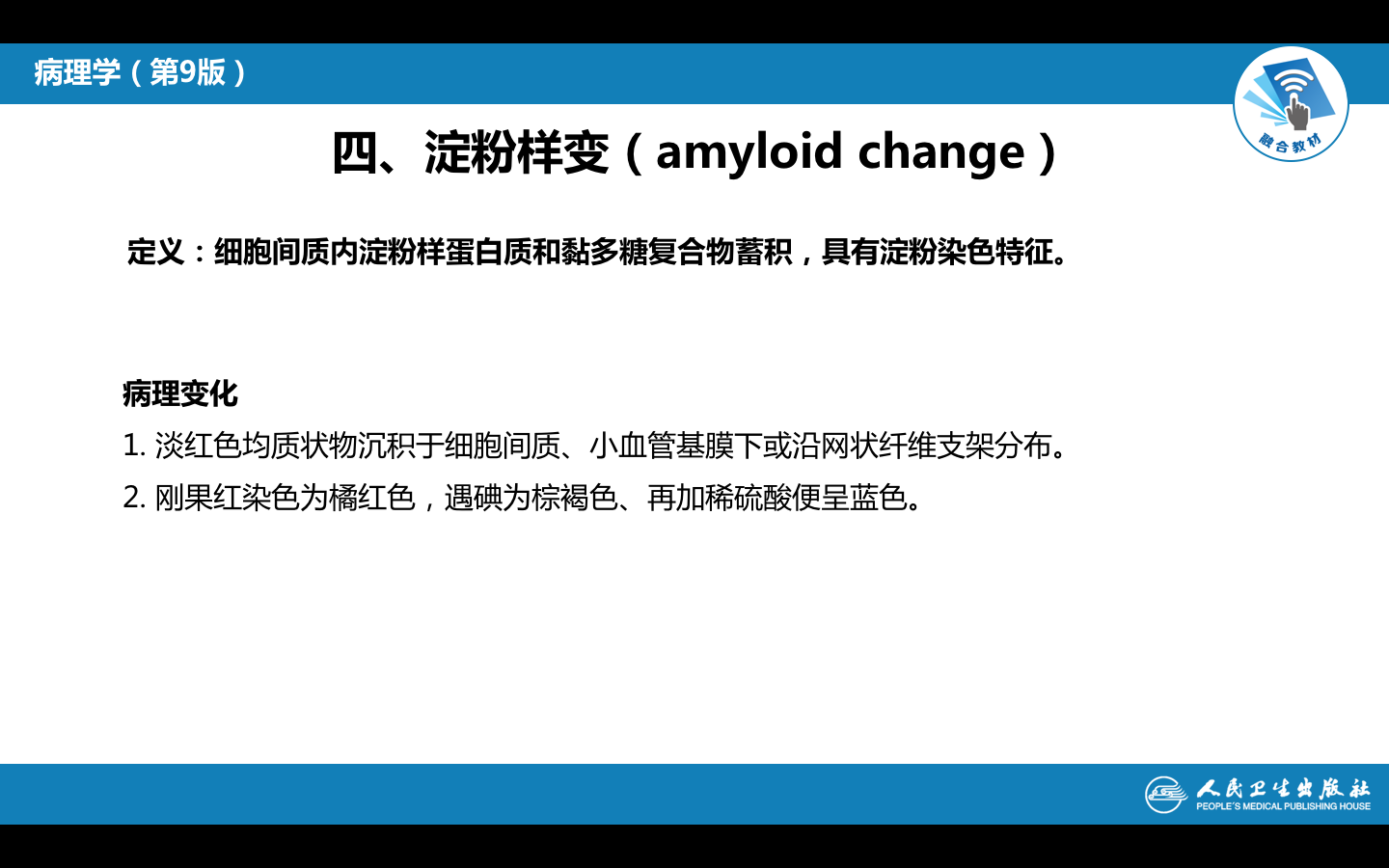 2.病变:镜下细胞外间质呈淡红色的均质状。因与淀粉遇碘反应相似故得名(刚果红染色为桔红色,遇碘则为棕褐色,再加稀硫酸便呈蓝色)。