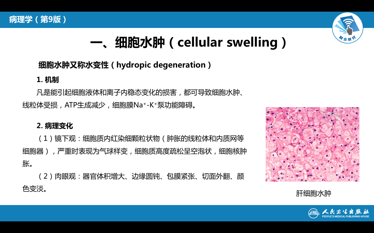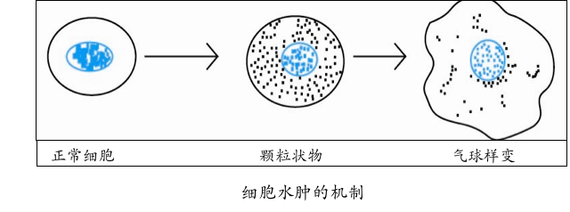 线粒体受损,ATP生成减少,细胞膜Na+-K+泵功能障碍,导致细胞内钠离子积聚,吸引大量水分子进入细胞。心肌细胞、肝细胞、肾小管上皮细胞常易发生细胞水肿。