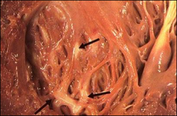 心肌脂肪变性多见于左心室心内膜下乳头肌,脂肪变心肌呈黄色,与正常心肌的暗红色相间,形成黄红色斑纹,称“虎班心”