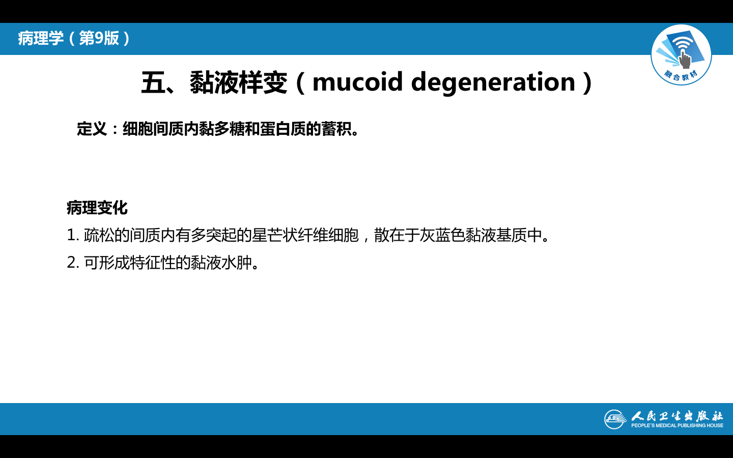 1.定义:细胞间质出现淀粉样蛋白质-粘多糖复合物沉淀。