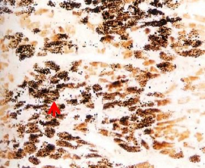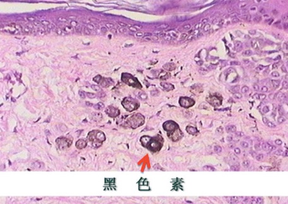 • 正常状态下:黑色素是由黑色素细胞产生的深褐色颗粒状色素,见于皮肤、毛发、虹膜及脉络膜