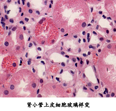 (1)细胞内玻璃样变 变常表现为均质红染的圆形小体或团块,位于细胞质内。 |