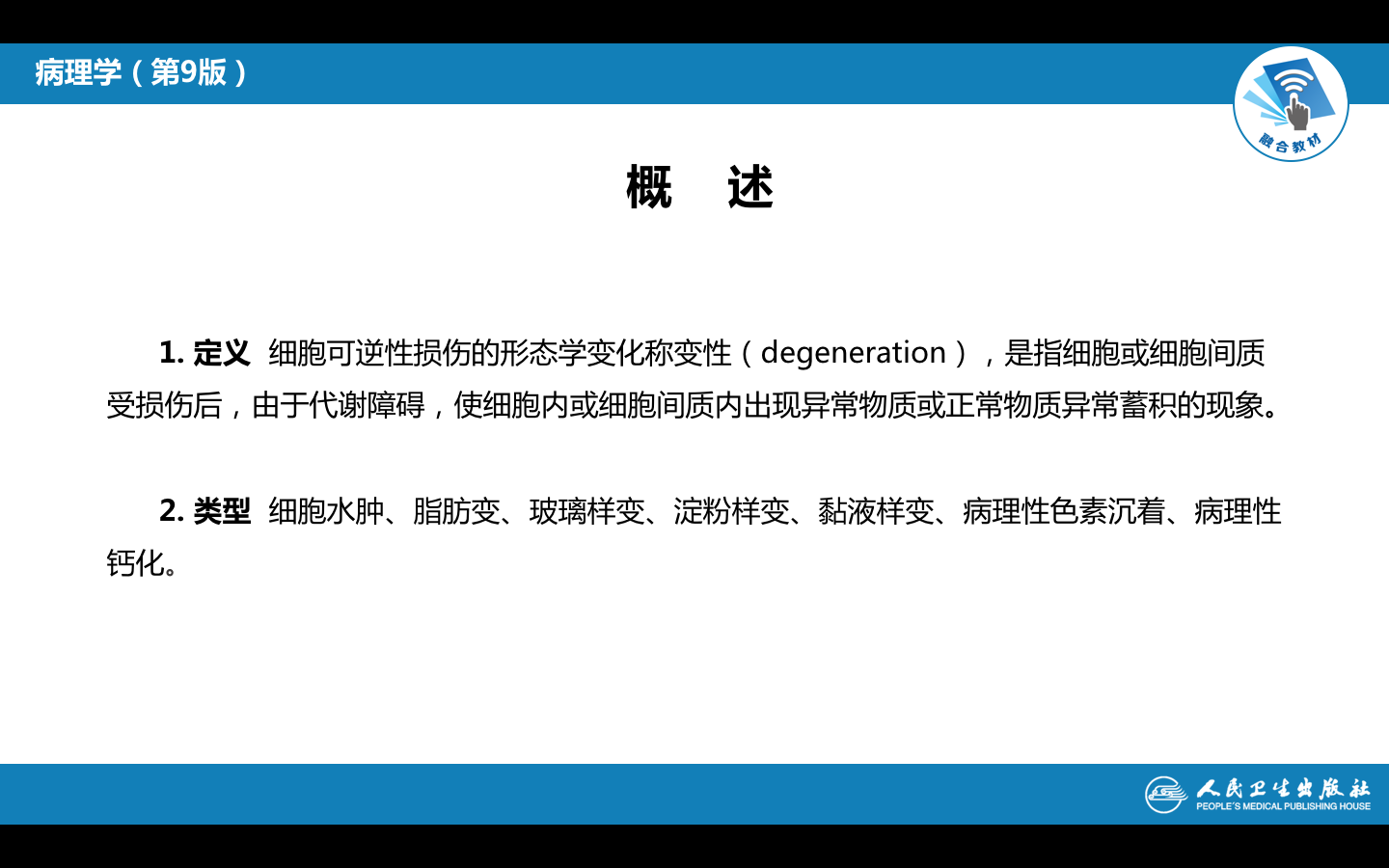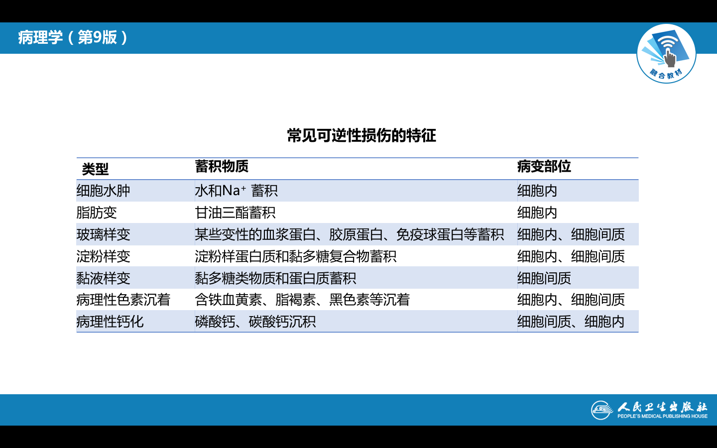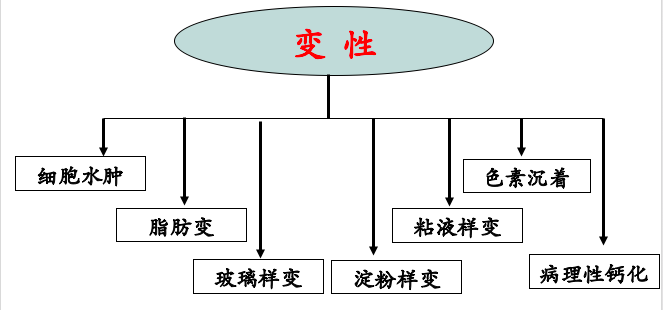 当细胞或细胞间质受损伤后,由于代谢障碍,使细胞内或细胞间质内出现异常物质或正常物质异常蓄积的现象,称为可逆性损伤(reversible injury),也称为变性(degerneration),通常伴有细胞功能低下。分类如下: