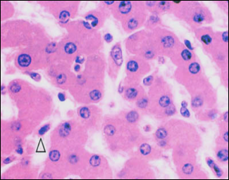 镜下: | 初期,细胞体积增大,胞质疏松、淡染(红染细颗粒状物),称为胞质疏松化。严重者胞质透明呈空泡状,似气球,细胞核也可肿胀,称为气球样变,多见于病毒性肝炎。 |