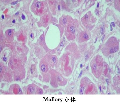病毒性肝炎、酒精性肝病时,因细胞内角蛋白堆积,肝细胞中出现红染的马洛里小体。