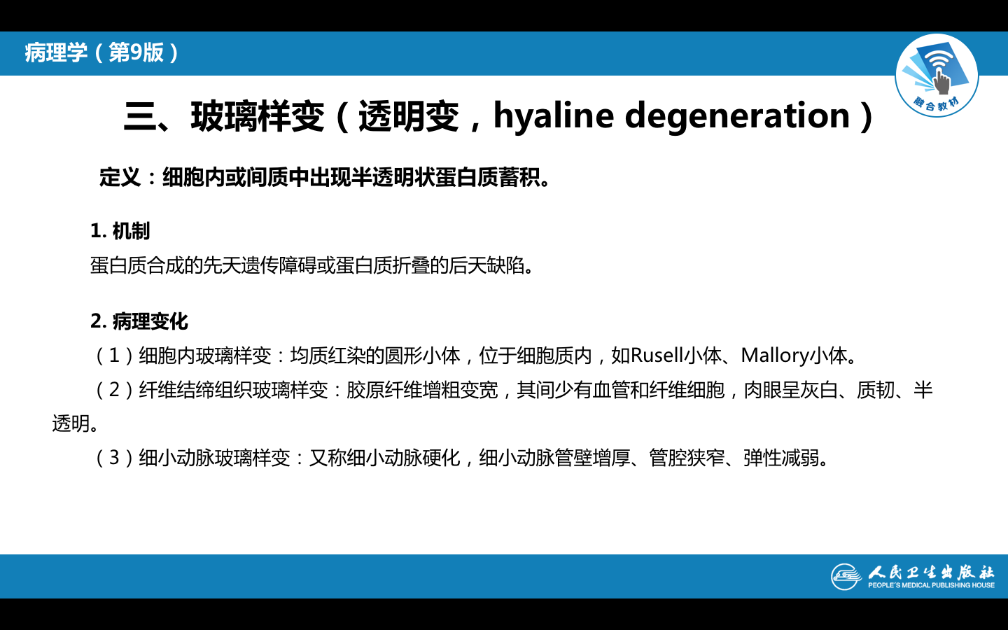 细胞内或间质中出现均质、半透明状的蛋白质蓄集。在HE染色中呈均质性红染,称玻璃样变或透明变。