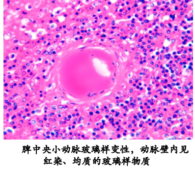 高血压和糖尿病的肾、脑、脾等细小动脉。因血浆蛋白渗入和基底膜样物质沉积于血管壁,使动脉壁增厚、变硬, 管腔狭窄。动脉壁内见有均质、红染无结构的玻璃样物质。