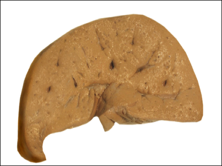 大体 | 器官体积增大,淡黄色,边缘圆钝,油腻感。 |