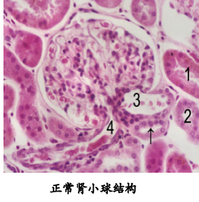 肾小球肾炎时,肾近曲小管上皮细胞吞饮滤出的血浆蛋白胞质内出现 粉染玻璃样小体。 |