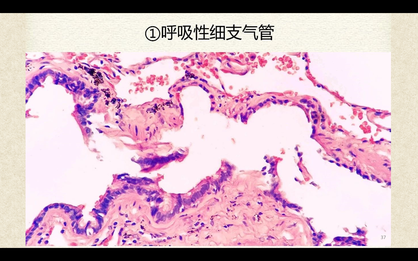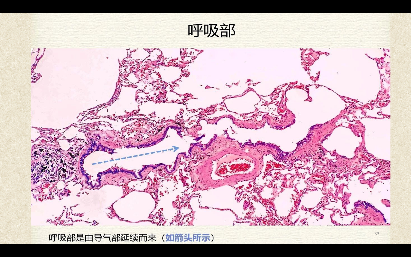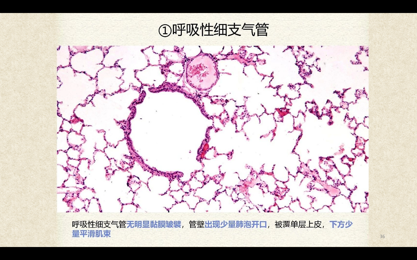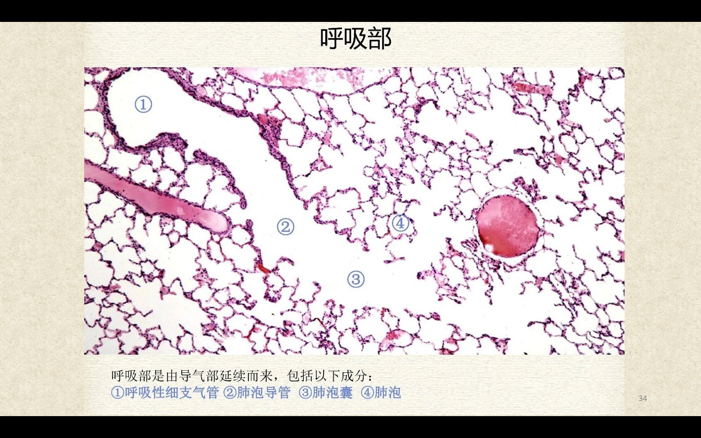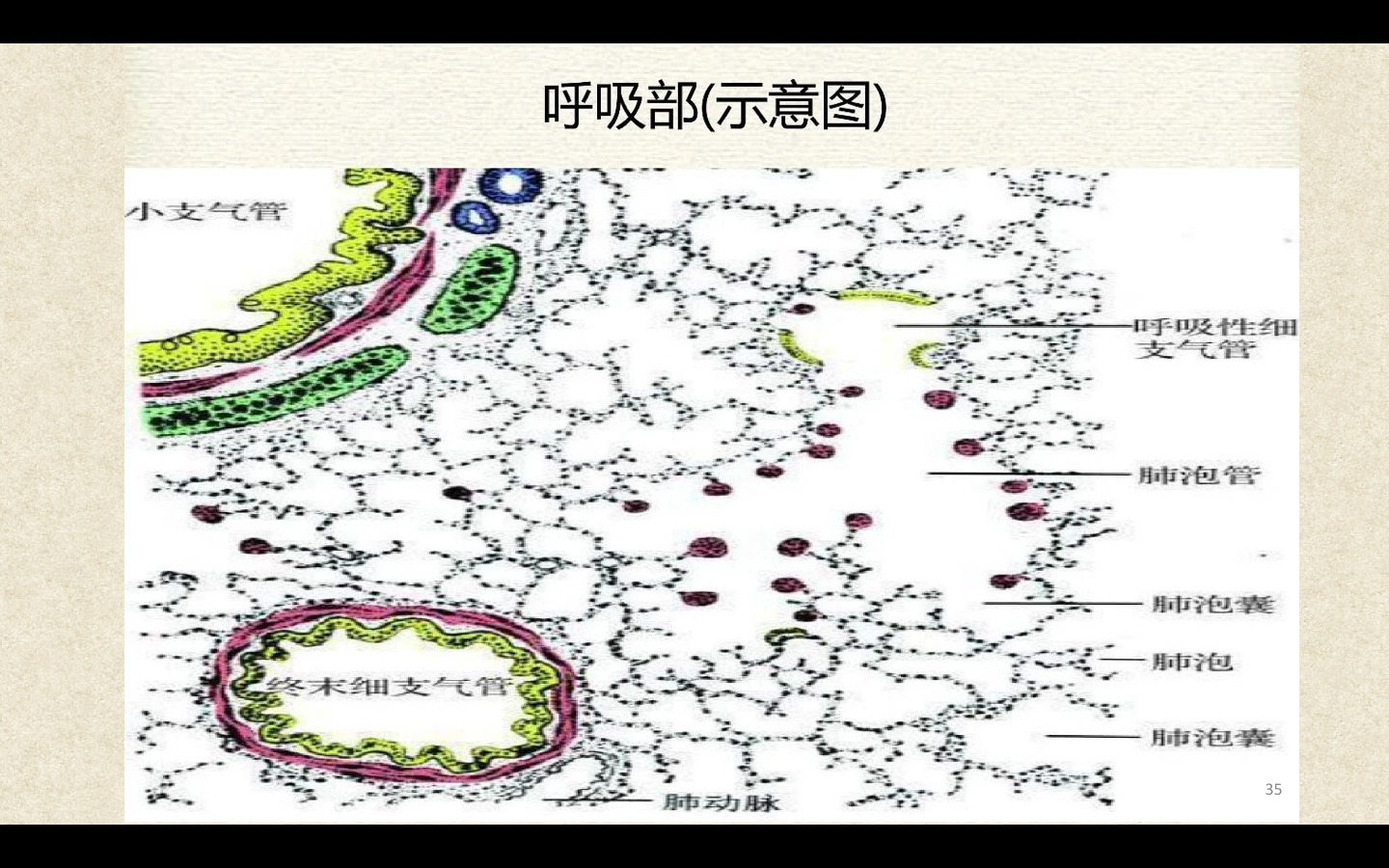 支气管由肺门进入肺中逐级分支形成支气管树,直径<1mm、壁内无软骨及粘膜下腺体者称为细支气管,细支气管的末段称为终末细支气管,当其管壁上有肺泡开口时,则称为呼吸细支气管。呼吸细支气管继续分支为肺泡管和肺泡囊。