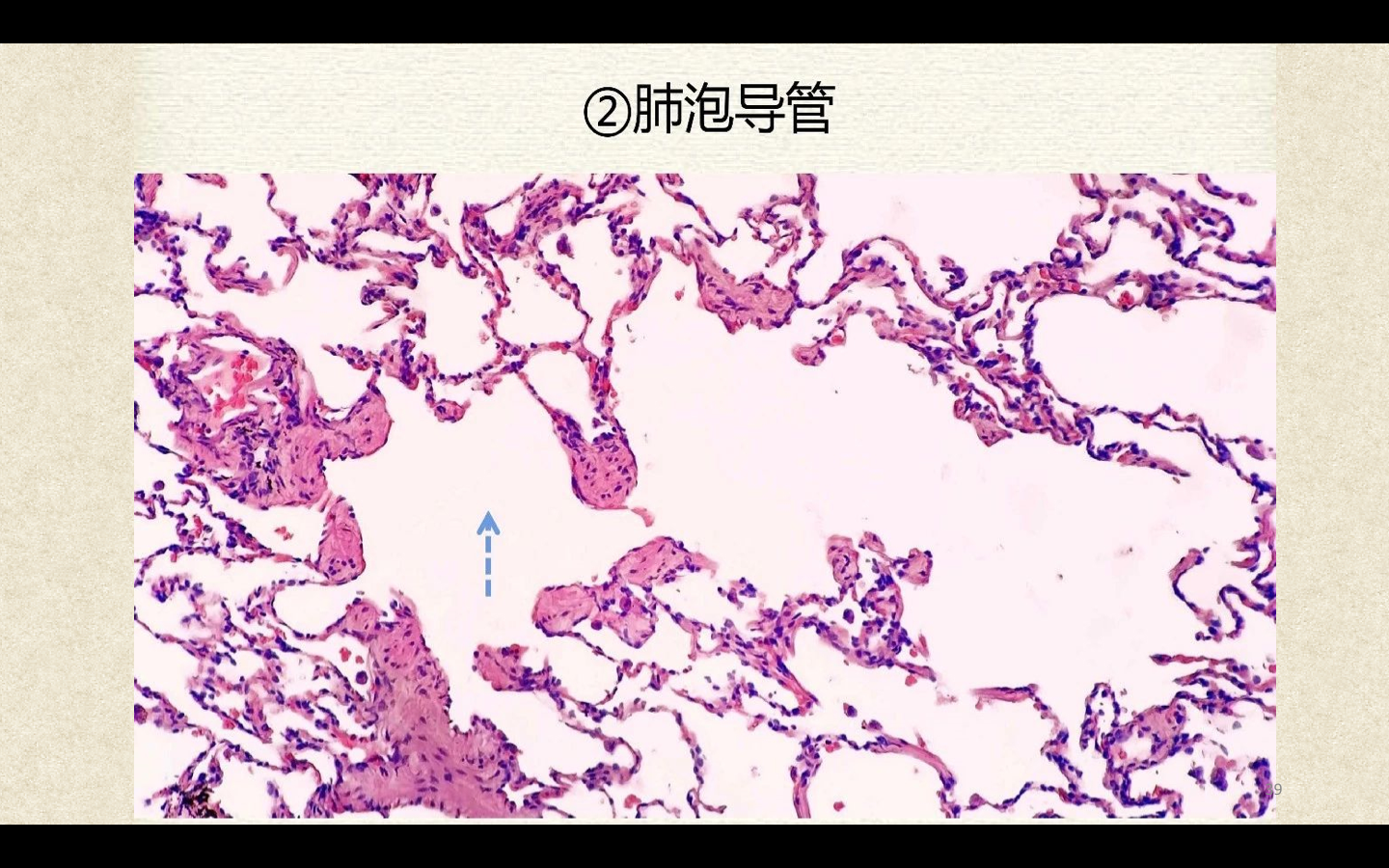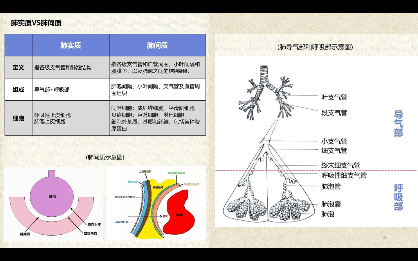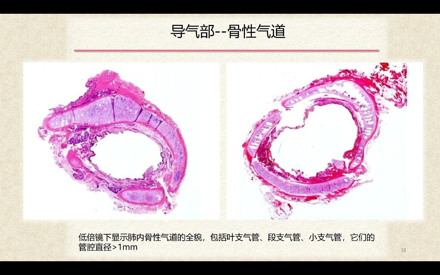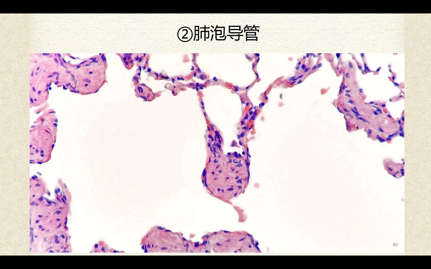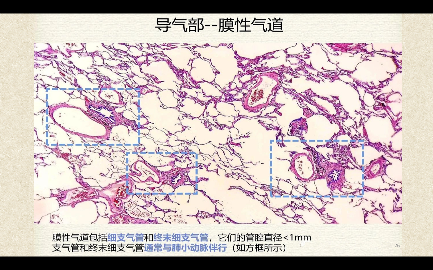支气管由肺门进入肺中逐级分支形成支气管树,直径<1mm、壁内无软骨及粘膜下腺体者称为细支气管,细支气管的末段称为终末细支气管,当其管壁上有肺泡开口时,则称为呼吸细支气管。呼吸细支气管继续分支为肺泡管和肺泡囊。