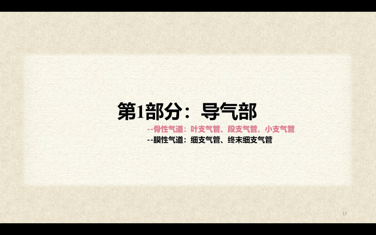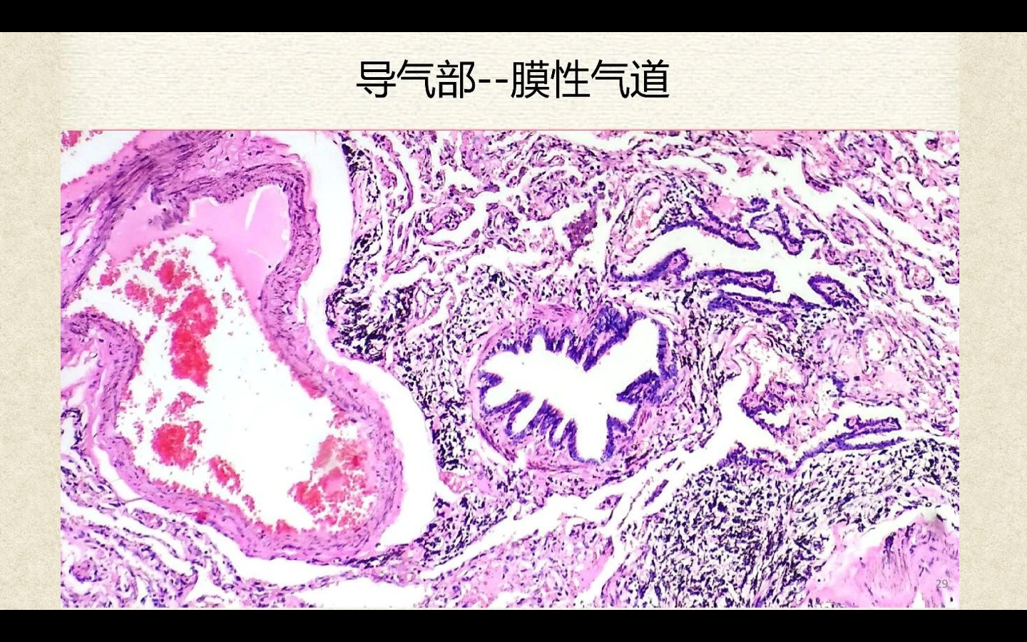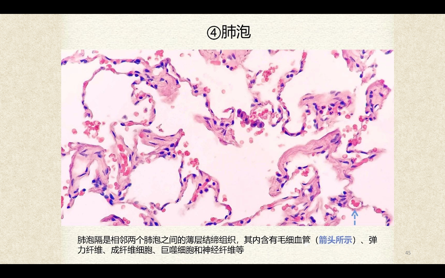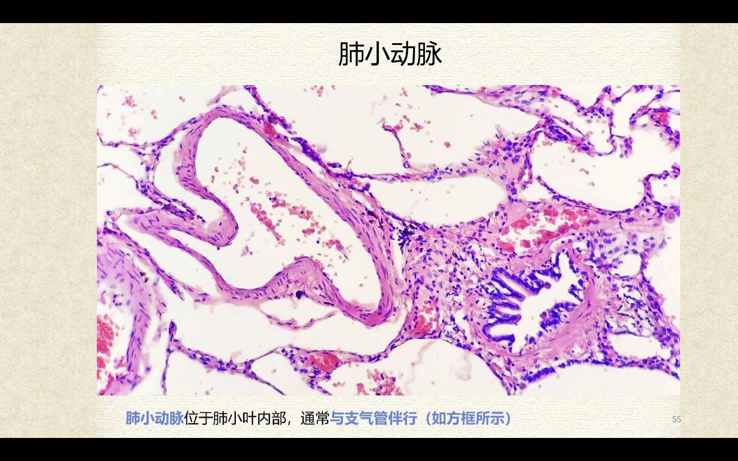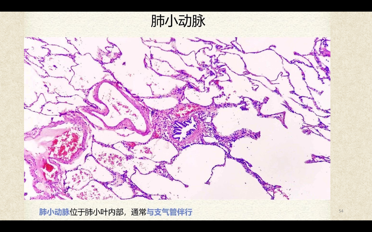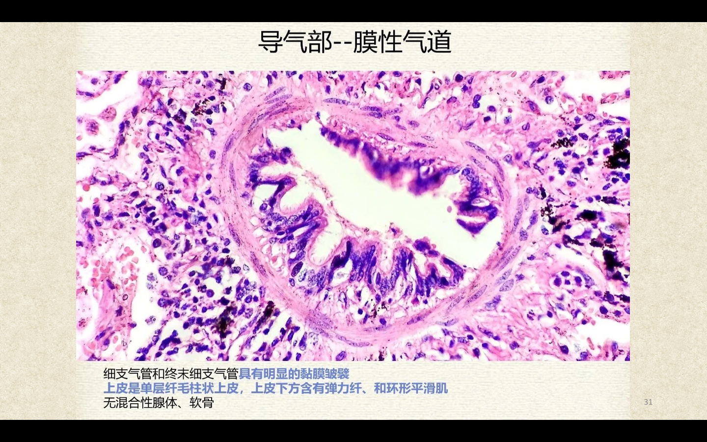 支气管由肺门进入肺中逐级分支形成支气管树,直径<1mm、壁内无软骨及粘膜下腺体者称为细支气管,细支气管的末段称为终末细支气管,当其管壁上有肺泡开口时,则称为呼吸细支气管。呼吸细支气管继续分支为肺泡管和肺泡囊。
