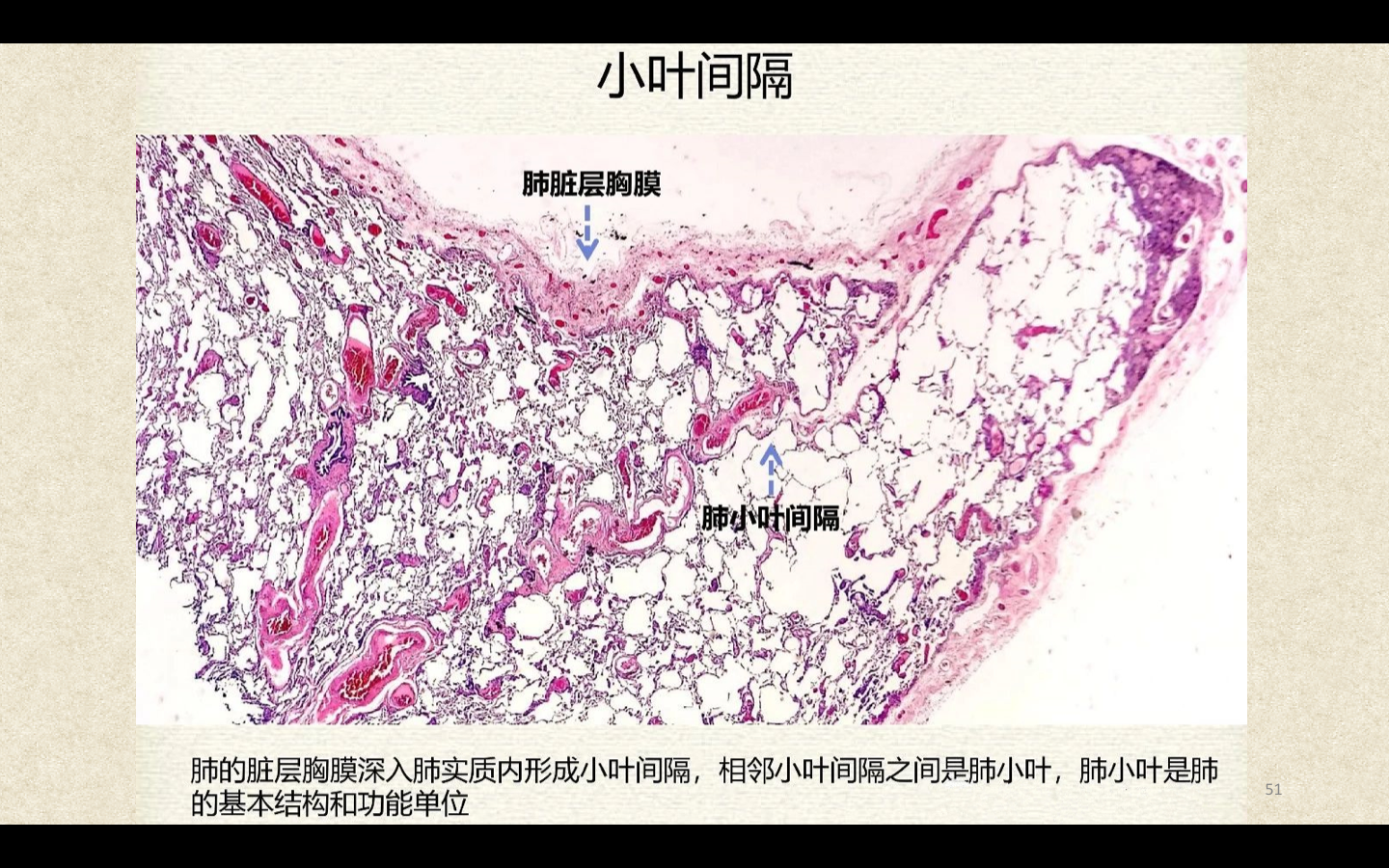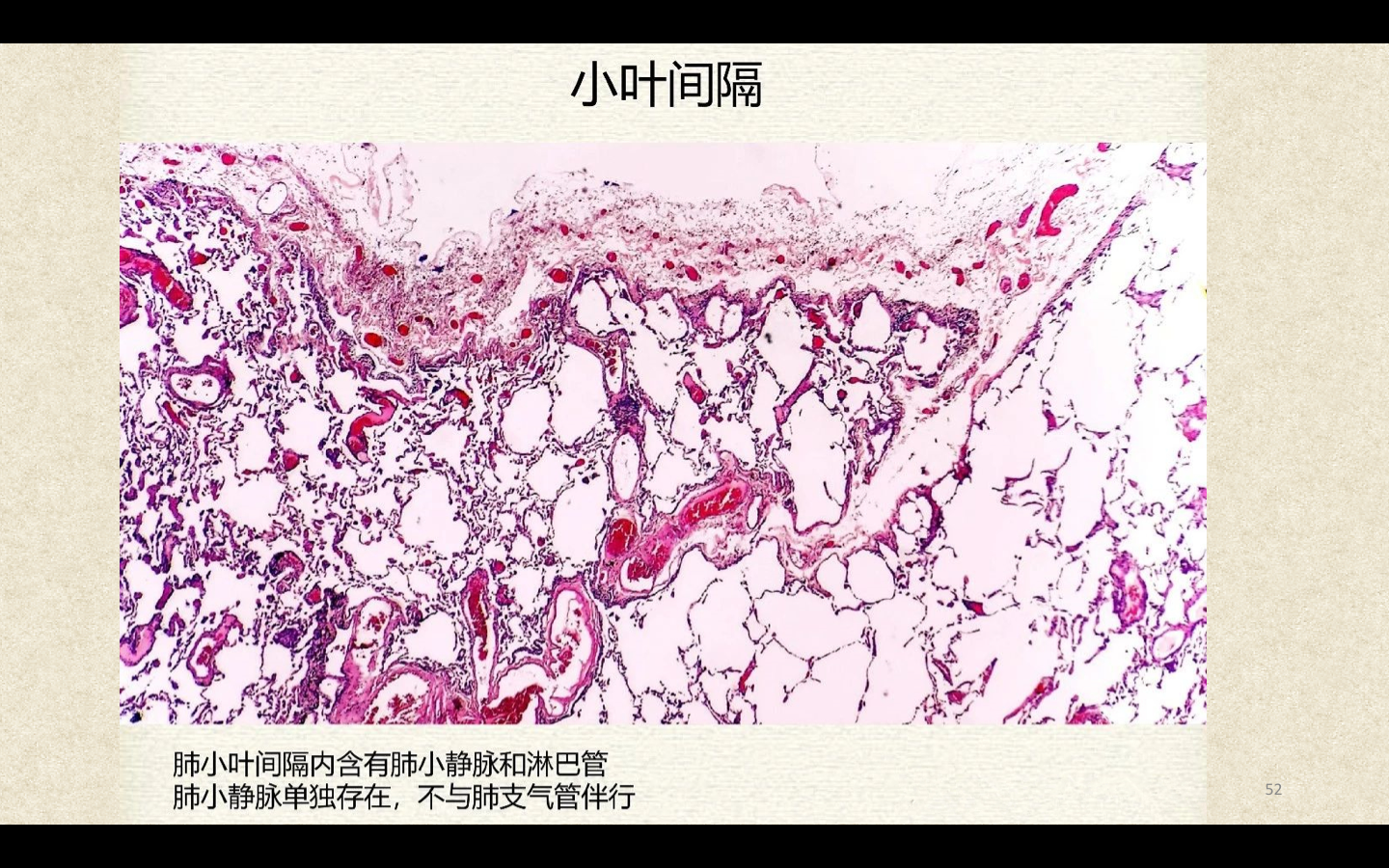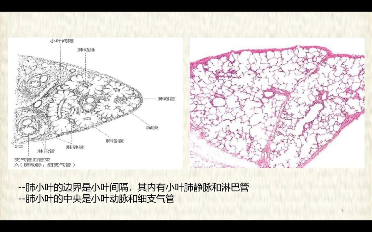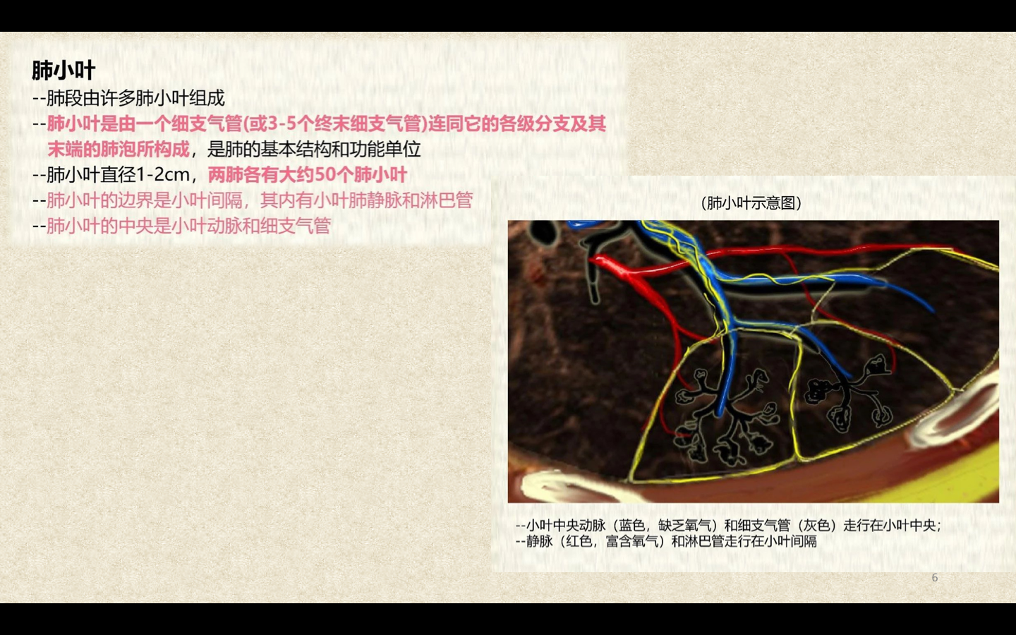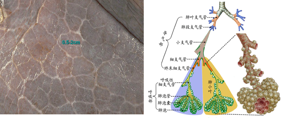 临床上通常将直径<2mm的小、细支气管统称为小气道。3~5个终末细支气管连同它的各级分支及分支末端的肺泡组成肺小叶(lobule),肺小叶呈大小不等的锥体形。Ⅰ级呼吸细支气管及其远端所属的肺组织称为肺腺泡(pulmonary acinus)。