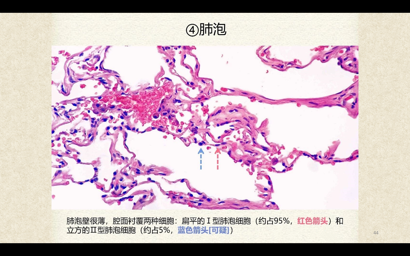 Ⅰ型肺泡上皮细胞呈扁平状,肺泡表面的90%以上为其覆盖。Ⅰ型肺泡上皮细胞、基底膜和肺泡壁毛细血管内皮细胞共同组成气血屏障,是气体交换必需经过的结构。
