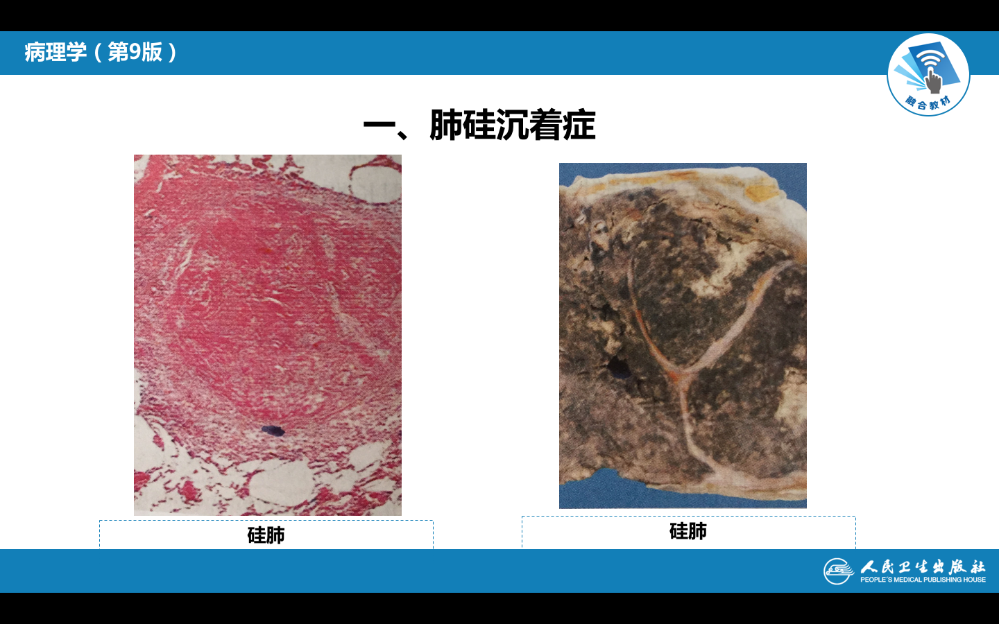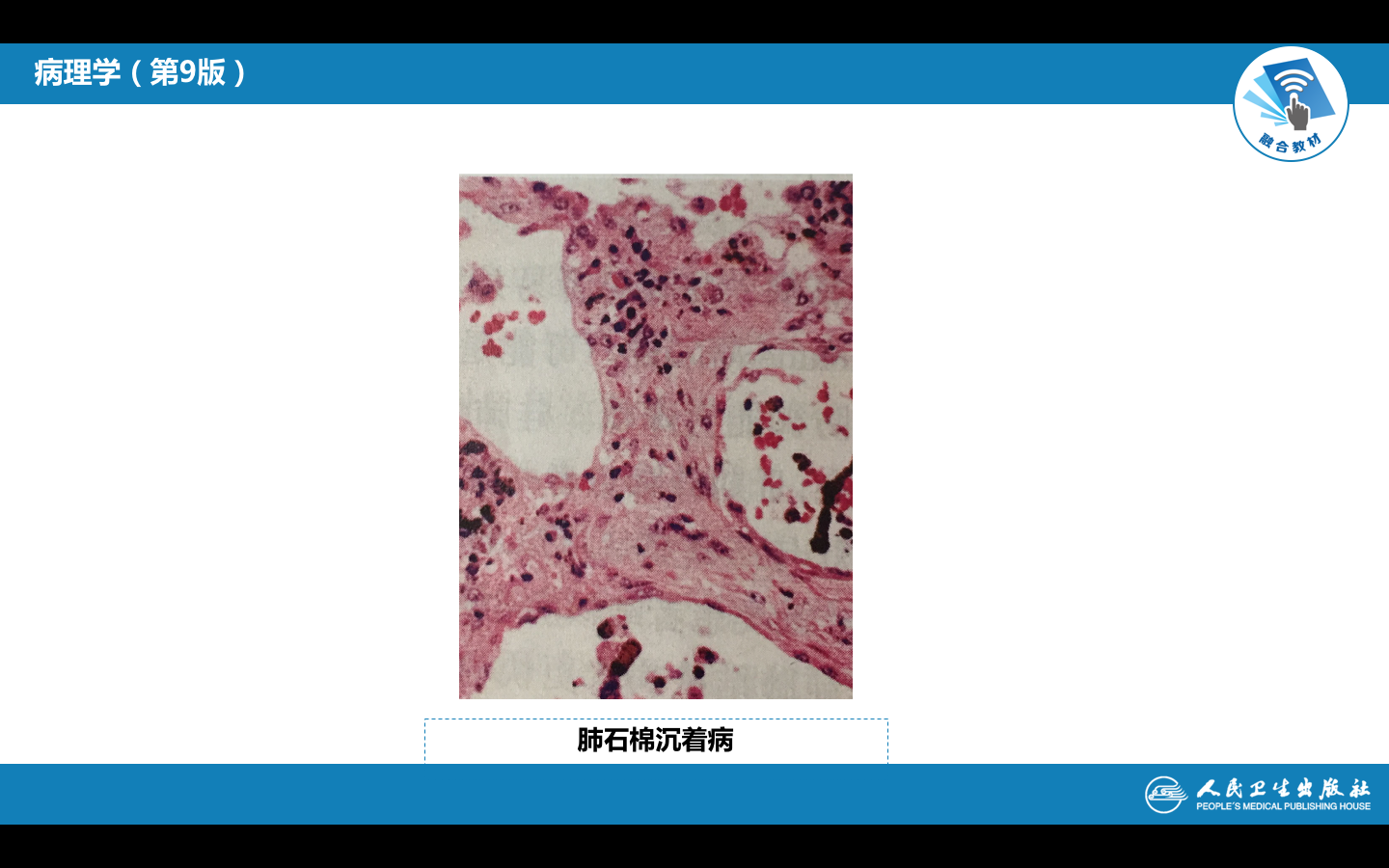 石棉肺的病变特点是肺间质弥漫性纤维化,石棉小体形成及脏层胸膜肥厚,壁层胸膜形成胸膜斑。肺部病变以双肺下叶为著。肉眼观,病变早期,由于细支气管周围、肺泡壁、小叶间隔内纤维组织增生,使双肺下叶呈明显的纤维网状结构。晚期,由于肺间质广泛纤维化,使肺体积缩小,质地变硬。常因伴明显的肺气肿和支气管扩张,肺组织呈蜂窝状改变。胸膜明显增厚并有纤维性粘连,甚至形成胸膜斑。胸膜斑是指发生于壁层胸膜上的局限性纤维瘢痕斑块,境界清楚,凸出于胸膜,质地坚硬,呈灰白色,半透明。常位于两侧中、下胸壁。镜下,早期病变是由于石棉纤维刺激引起的脱屑性间质性肺炎,肺泡腔内见大量脱落的Ⅱ型肺泡上皮细胞和巨噬细胞,肺间质内可见大量淋巴细胞、单核细胞浸润。小动脉受累呈现闭塞性动脉内膜炎。细支气管周围、肺泡间隔、小叶间隔内纤维组织增生,并发展成肺组织弥漫性纤维化。在增生的纤维组织中可见多数石棉小体,其表面有铁蛋白沉积的石棉纤维。小体大小不等,黄褐色,分节状,两端膨大,中央为棒状,呈哑铃形。其旁有时可见异物巨细胞,普鲁氏蓝染色时小体常呈阳性铁反应。检出石棉小体是病理诊断石棉肺的重要依据。