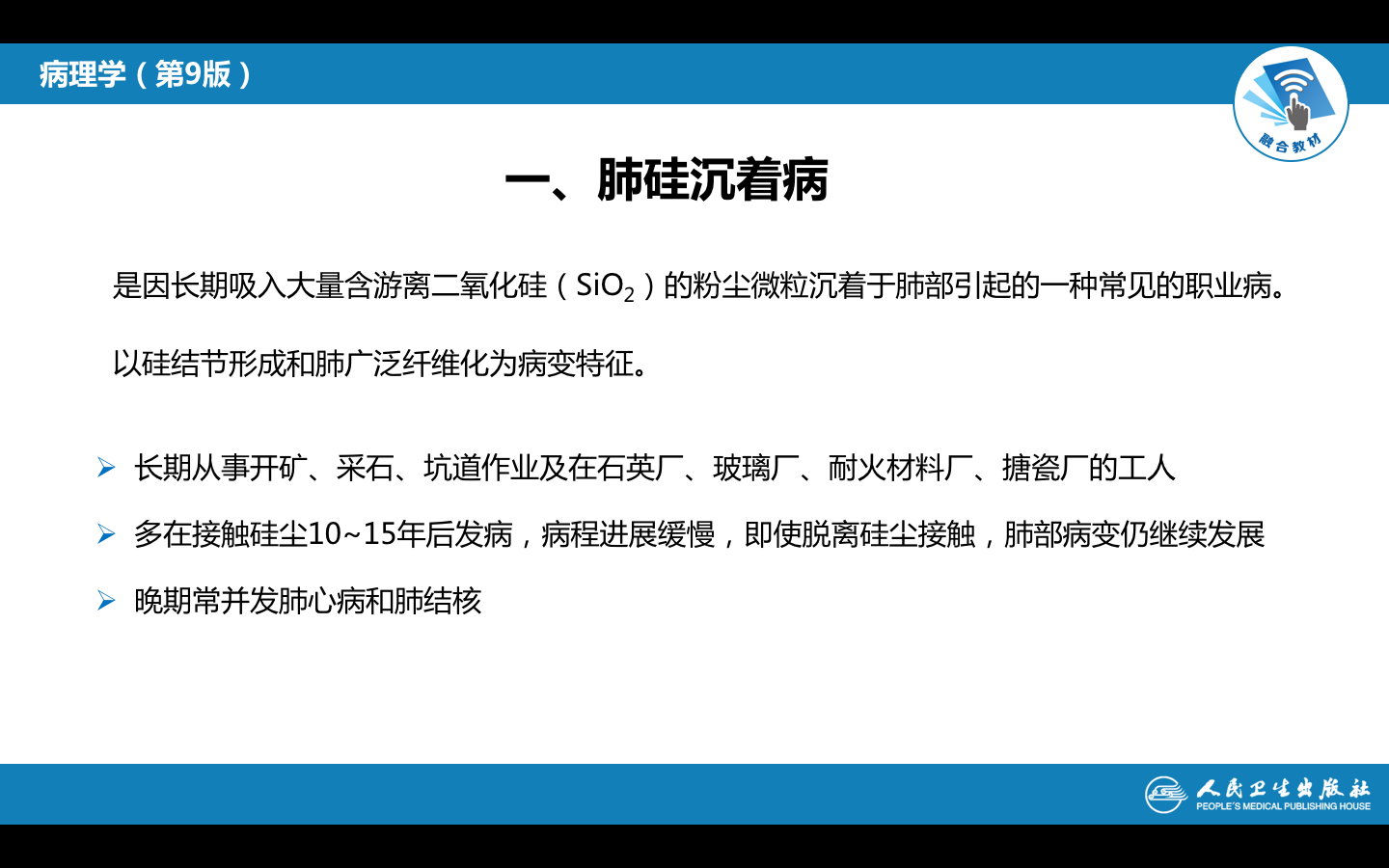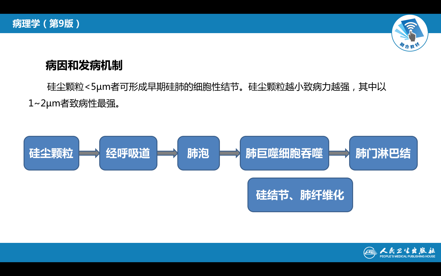 硅肺的病因是吸入含游离二氧化硅的粉尘。硅肺的发病与石英的类型、粉尘中游离二氧化硅的含量、粉尘颗粒大小、接触时间、防护措施及呼吸道防御功能削弱等因素有关。硅尘颗粒愈小,在空气中的沉降速度愈慢,被吸入的机会也愈多。一般直径>5μm的硅尘被吸入后,通常可被呼吸道粘膜阻挡或通过粘液纤毛排送系统而咳出,不能进入肺内。<5μm的硅尘颗粒则可被吸入肺内并沉积于肺间质而致病。尤其是1~2μm的硅尘颗粒致病力最强。少量硅尘颗粒被吸入肺后,可由巨噬细胞吞噬并带走。若吸入的硅尘量超出肺的清除能力,或肺的清除能力减弱,特别是气道的清除能力降低均可导致硅尘在肺内的沉积。