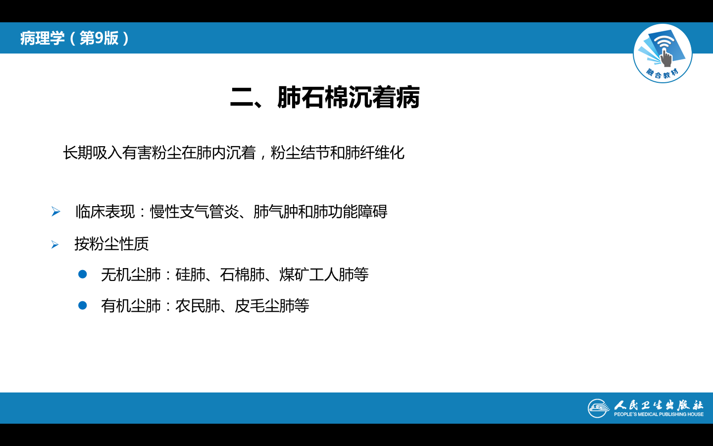 肺石棉沉着症也称石棉肺(asbesesis),是因长期吸入石棉粉尘而引起的以肺间质纤维化为主要病变的职业性尘肺。石棉是含有多种化学元素的硅酸盐复合物,具有高度的抗热性,被广泛用于隔热绝缘材料。石棉矿的开采及运输工人,石棉加工厂和石棉制品厂的工人长期在操作过程中吸入石棉粉尘而导致石棉肺。本病在不知不觉中发病,患者逐渐出现咳嗽、咳痰、气急胸闷等症状,晚期因并发肺源性心脏病而出现右心室肥大。