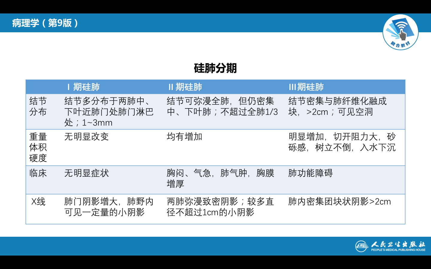 Ⅲ期硅肺:硅结节密集且融合成肿瘤样团块。X线检查可见团块状硅结节阴影,直径可达2cm,团块状结节中央可有硅肺空洞形成。胸膜明显增厚。肺的重量、体积、硬度明显增加,浮沉实验全肺入水下沉。