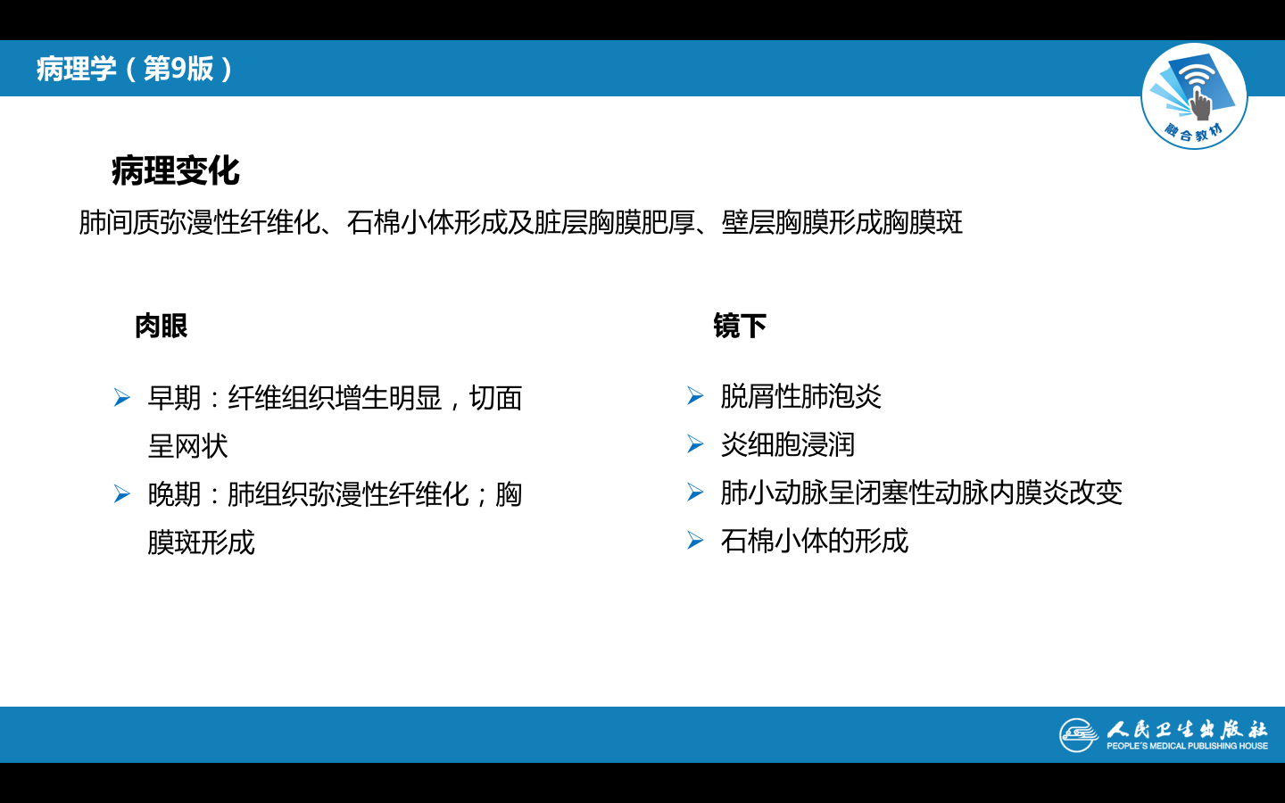 肺内尚有不同程度的间质弥漫性纤维化,在血管、支气管周围及肺泡间隔纤维组织增生,为致密的有玻璃样变的胶原纤维。此外,胸膜也因纤维组织弥漫增生而增厚,可达1~2cm。