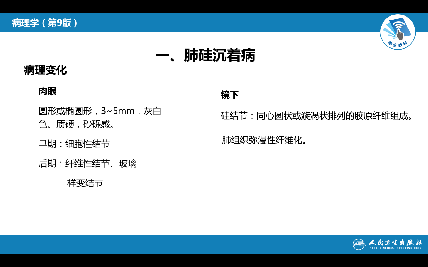 硅沉着症的基本病变是肺及肺门淋巴结内硅结节(silicotic nodule)形成和肺间质弥漫性纤维化。硅结节为境界清晰的圆形、椭圆形结节,直径2~5mm,灰白色,质坚实,触之有砂粒感。随着病变的不断进展,硅结节逐渐增大或相互融合成团块状,中心常因缺血缺氧而发生坏死液化,形成硅肺性空洞。镜下,硅结节的形成和发展过程大致可分为:①细胞性结节,为早期硅结节,由吞噬硅尘的巨噬细胞聚集在局部形成的;②纤维性结节,由纤维母细胞、纤维细胞和胶原纤维组成,纤维组织呈同心圆状排列;③玻璃样结节,纤维性结节从中心开始发生玻璃样变,最终形成典型的硅结节,由呈同心圆状或漩涡状排列的、已发生玻璃样变的胶原纤维构成)。结节中央往往可见内膜增厚的血管。