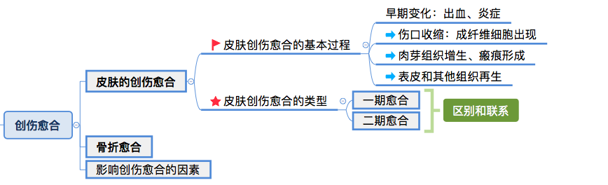 一期愈合(primary healing)见于组织缺损少、创缘整齐、无感染、经粘合或缝合后创面对合严密的伤口,例如手术切口。这种伤口中只有少量血凝块,炎症反应轻微,表皮再生在1~2天内便可完成。肉芽组织在第2天就可从伤口边缘长出并很快将伤口填满,5~6天胶原纤维形成(此时可以拆线),约2~3周完全愈合,留下一条线状瘢痕。一期愈合的时间短,形成瘢痕少,抗拉力强度大。