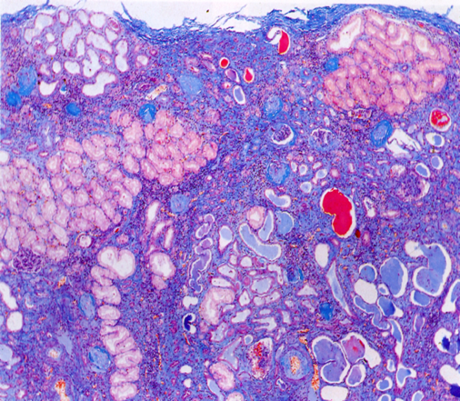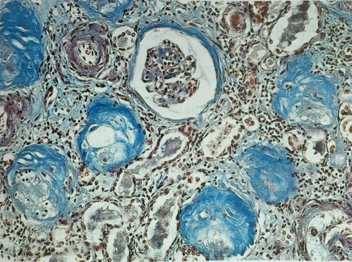 光镜下:大量肾小球硬化、玻璃样变(超过全部肾小球的50%)。肾小球中央部分变为无细胞、嗜伊红、PAS阳性之玻璃样小体,周围部分纤维化(如下图)。少数肾小球结构残存。硬化肾小球所属肾小管萎缩、消失、使玻璃样变的肾小球相互靠拢集中。残留肾单位常呈代偿性肥大,肾小球体积增大,肾小管扩张。间质纤维组织增生并有大量淋巴细胞、浆细胞浸润。间质内小动脉硬化,管壁增厚,管腔狭窄。