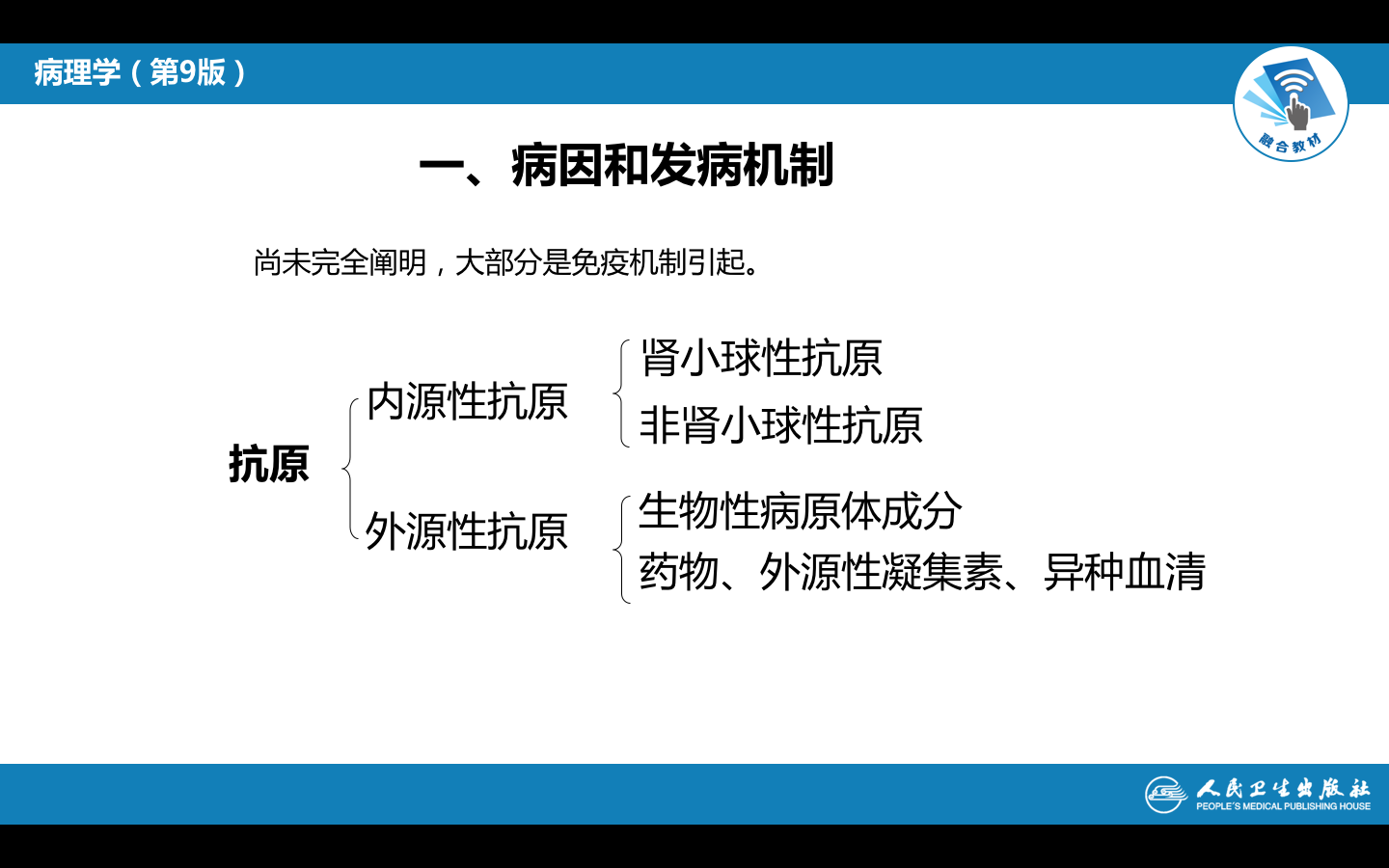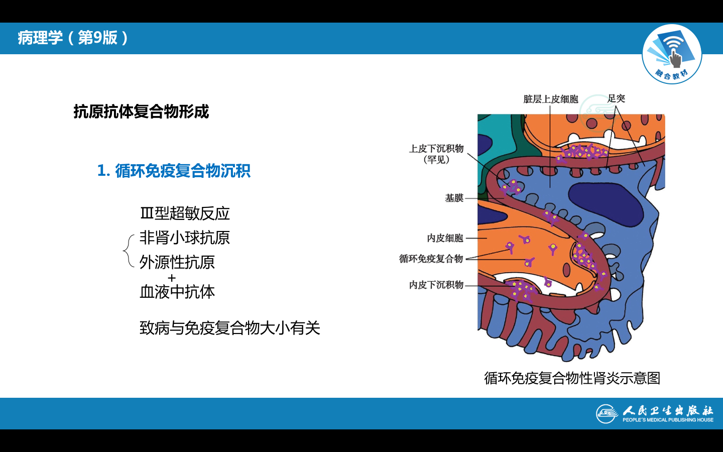 免疫复合物 (抗原-抗体复合物) 在血循环中形成,它们随血液循环流经肾脏时,在肾小球内沉积下来,引起肾小球损伤。循环免疫复合物的抗原可为外源性和内源性,但均为非肾小球性(即不属于肾小球本身的组成成分)。外源性抗原(如细菌、病毒、异种蛋白、药物等)和内源性抗原(如DNA、甲状腺球蛋白、肿瘤抗原等)均可刺激机体产生相应抗体,抗原和抗体在血液循环中结合而形成循环免疫复合物。