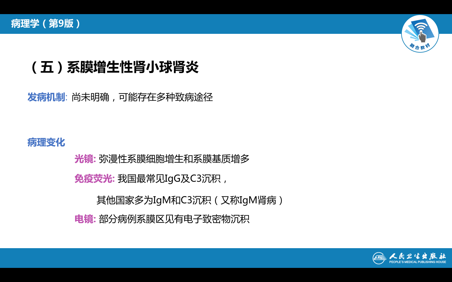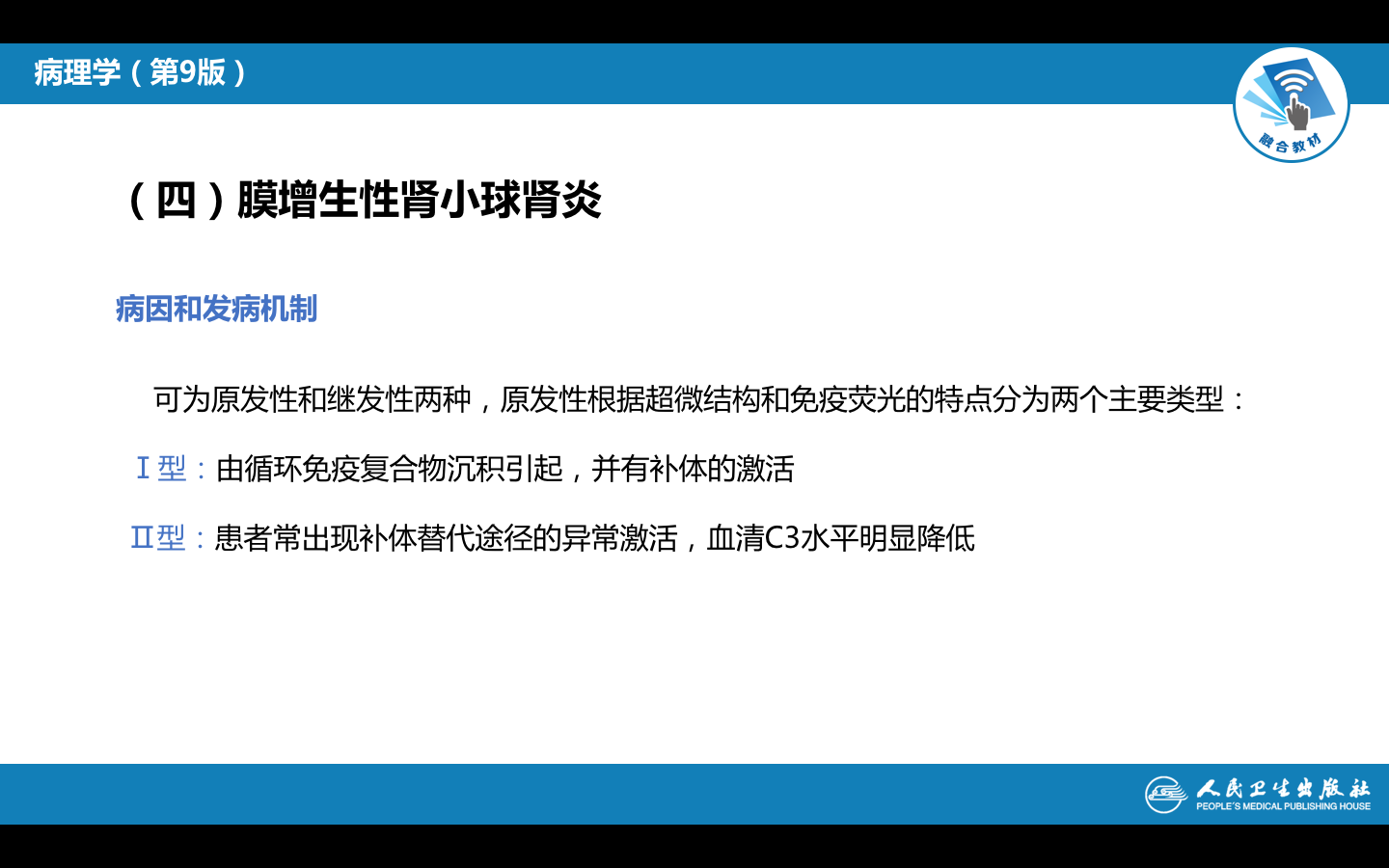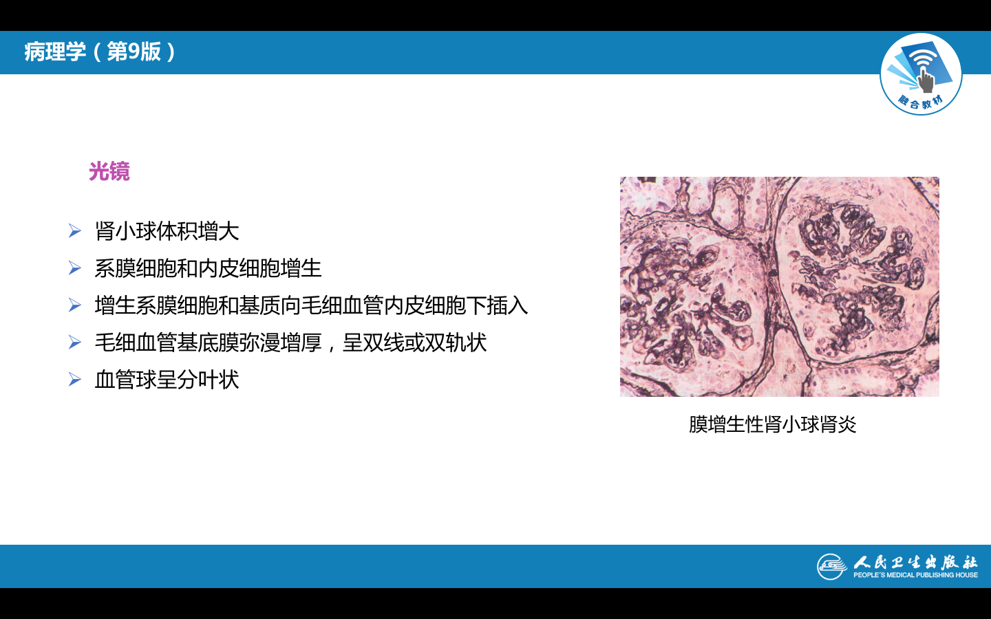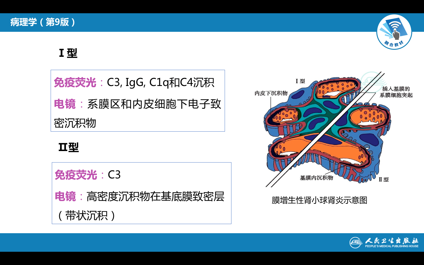 膜增生性肾小球肾炎(membranoproliferative glomerulonephritis)的病变特点是既有基底膜的增厚,又有系膜的增生。有两个亚型,Ⅰ型多见(90%),也称为系膜毛细血管性肾小球肾炎(mesangiocapillary glomerulonephritis),Ⅱ型少见(10%),也称为致密沉积物病(dense deposit disease)。有些病人持续性血清补体降低,又称为低补体血性肾小球肾炎(hypocomplementic glomerulonephritis)。