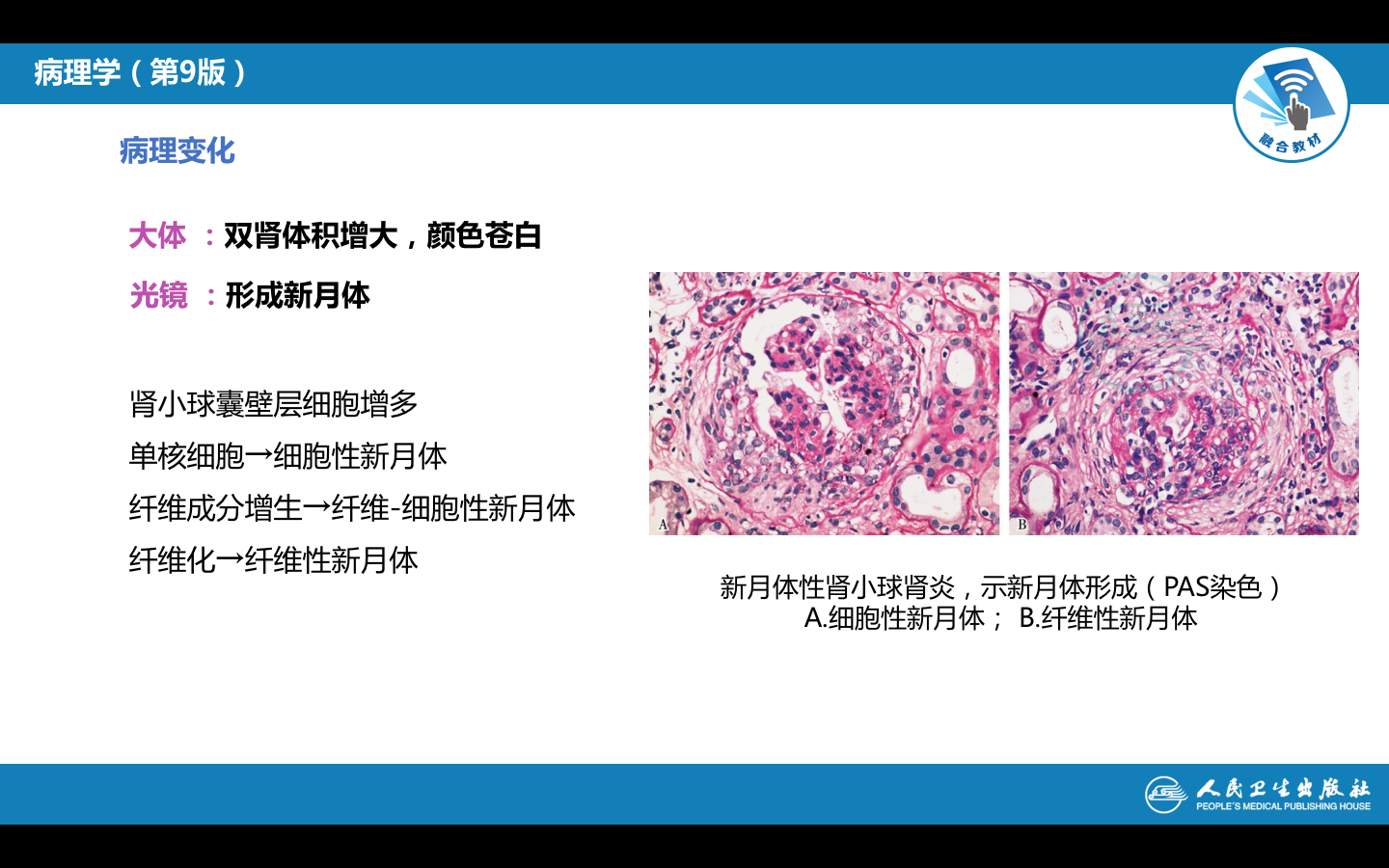 光镜下 病变肾小球毛细血管袢严重损伤,毛细血管壁断裂,血液流入肾小囊并凝固,导致肾小囊上皮细胞增生,形成新月体。有新月体的肾小球呈弥漫性,超过全部肾小球的50%。早期,构成新月体的主要成分是增生的肾小囊上皮细胞,其间混有单核巨噬细胞、中性粒细胞和纤维蛋白。此种以细胞成分为主的新月体,称为细胞性新月体(cellular crescent)。进而上述细胞转化为成纤维细胞,并产生胶原纤维,形成细胞和纤维共存的细胞纤维性新月体(fibrous crescent)。后期,细胞成分完全被纤维组织代替,形成纤维性或硬化性新月体。肾小管萎缩,肾间质纤维化。