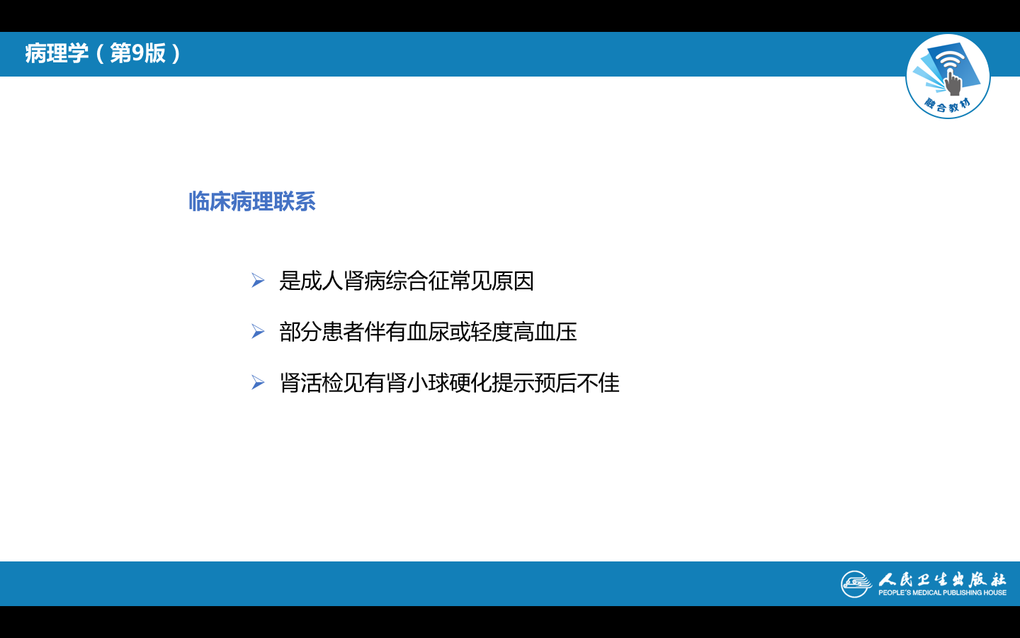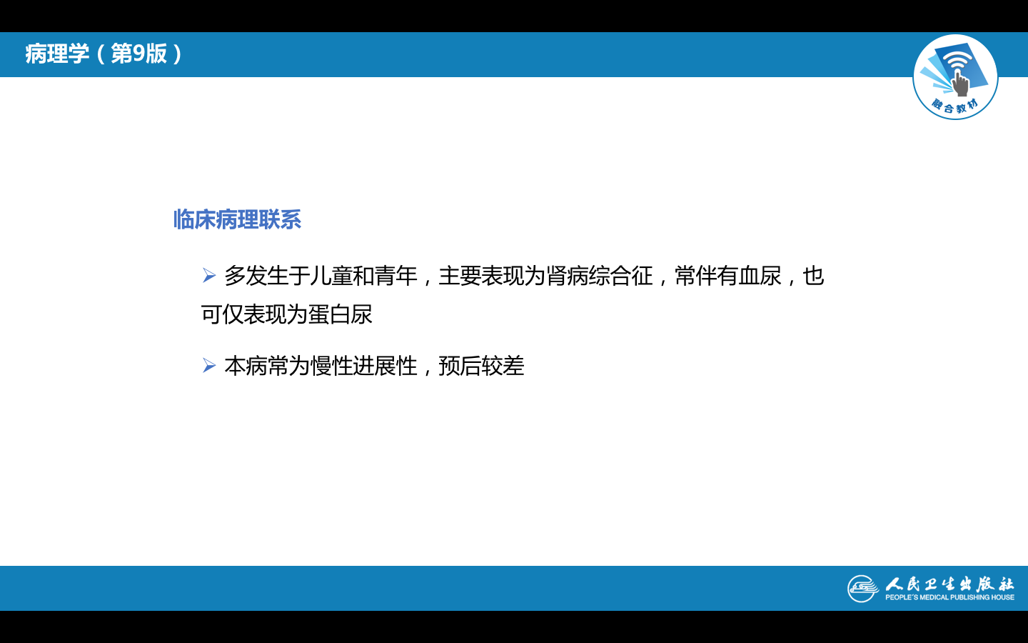 (2) 临床表现:表现为肾病综合征,伴血尿和高血压,对糖皮质激素治疗不敏感。病变为进行性,约半数在5年内发展至肾功能衰竭。