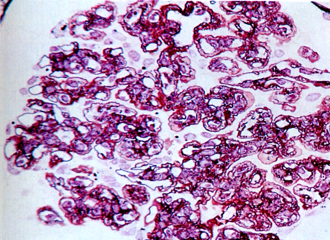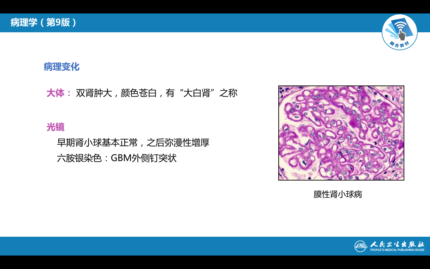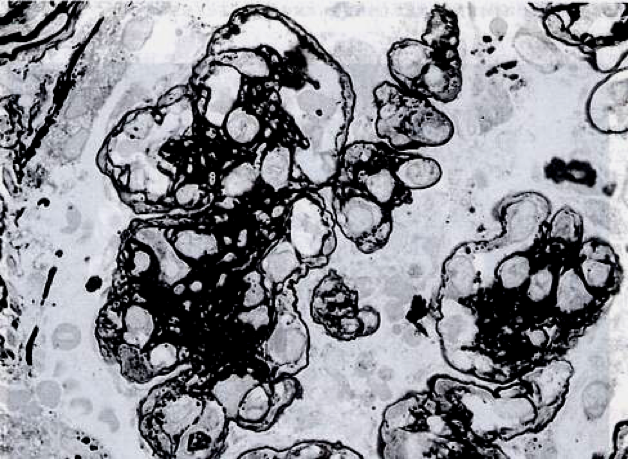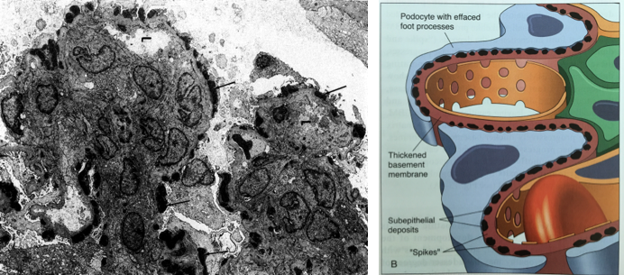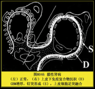 光镜下:弥漫性基底膜增厚,上皮下免疫复合物沉积(用Masson染色呈红色),免疫复合物之间新生的基底膜样物质形成钉状突起(spike)(镀银染色呈黑色)。初期毛细血管管腔无显著变化,后期基底膜显著增厚,毛细血管管腔变狭窄。
