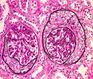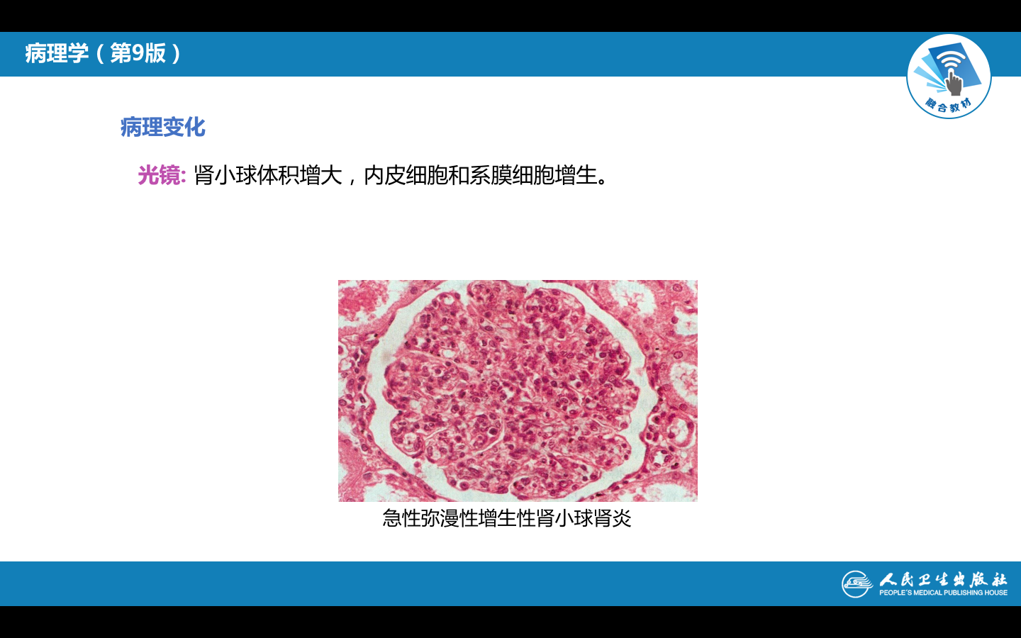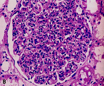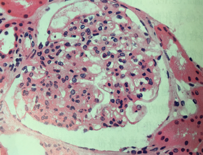 光镜下: 弥漫性肾小球肿胀,细胞数目显著增多(hypercellular)是其主要特征。系膜细胞、内皮细胞明显增生肿胀为主,早期尚可见多少不等的中性白细胞和单核细胞浸润。增生的细胞使毛细血管管腔狭窄、甚至闭塞,从而导致肾小球缺血。少数严重病例可见肾小球壁层和脏层上皮细胞增生, 壁层细胞的增生形成新月体,易引起肾小球纤维化,如数量少,对功能影响不大。如病变广泛可发展为新月体性肾炎。