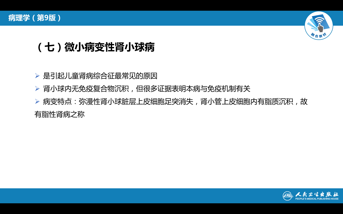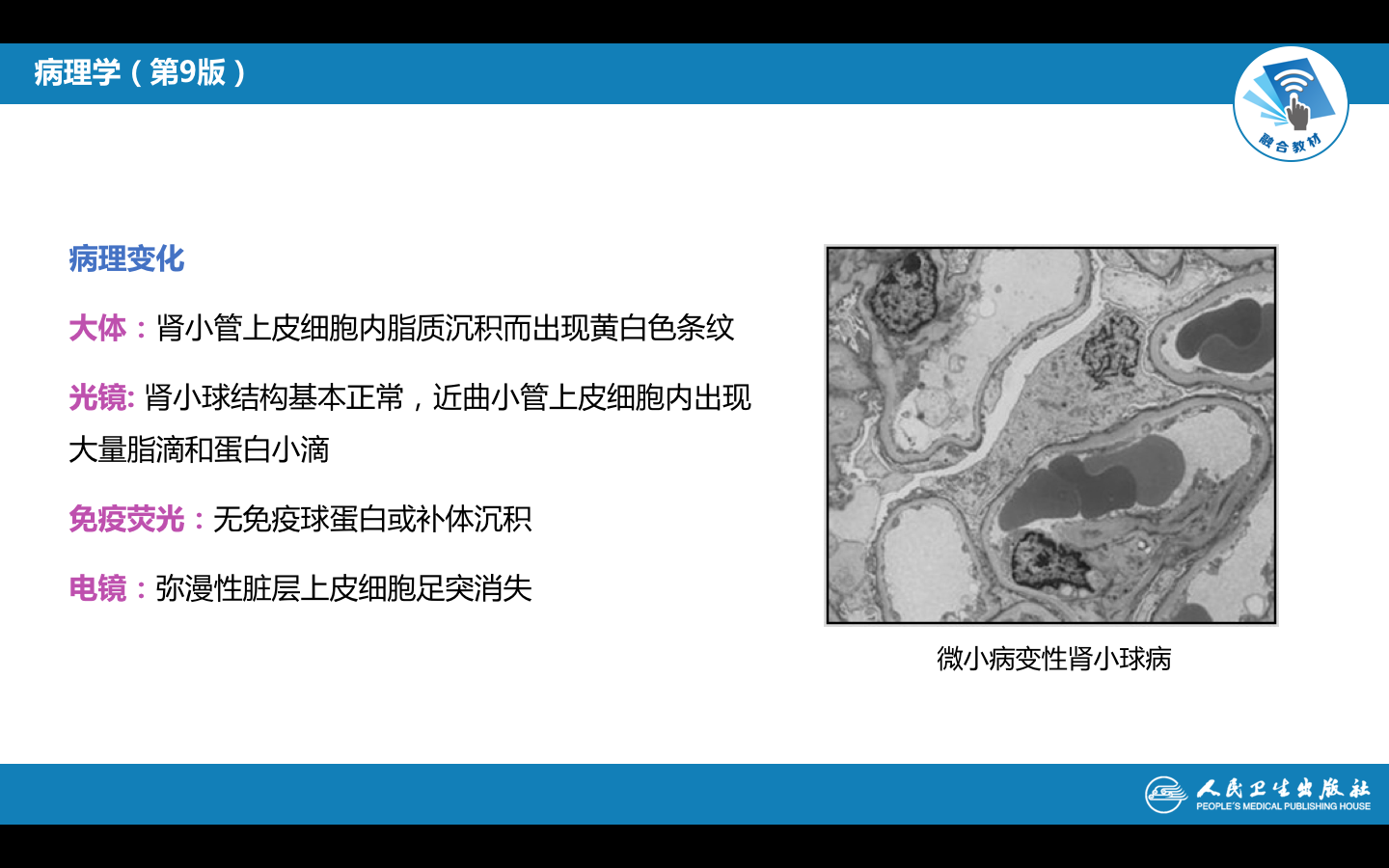 (1)病理变化 :光镜下肾小球无病变或仅见局灶节段性轻度异常。近端肾小管上皮细胞内可见脂滴空泡,故又称脂性肾病(lipoid nephrosis)。