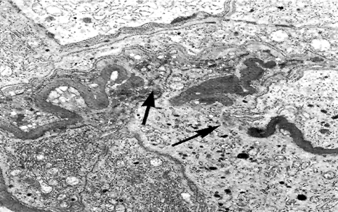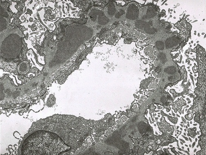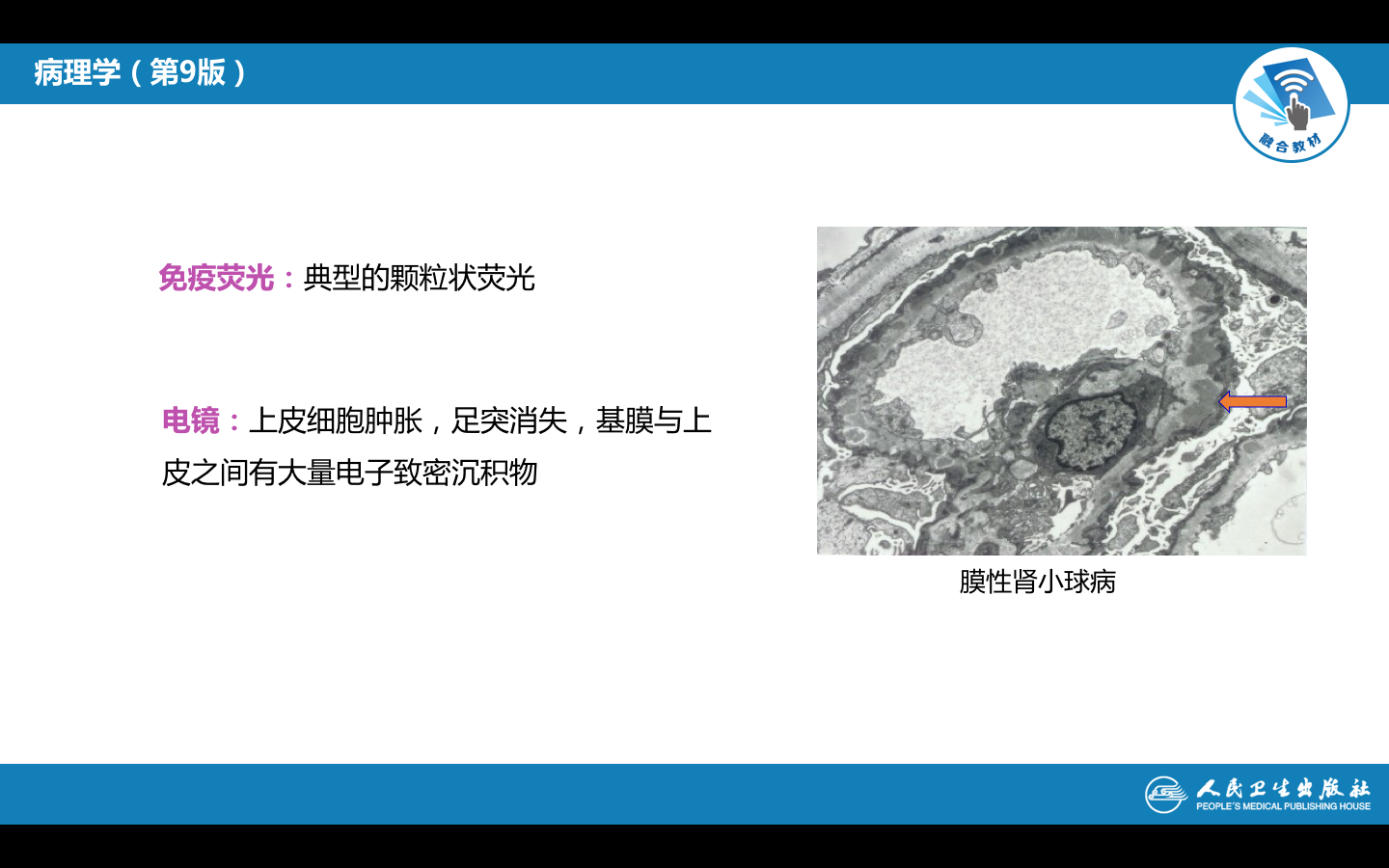 电镜下观察,以上皮下电子致密物沉积和电子致密物之间新生基底膜样物质形成钉状突起为特征,不同时期表现不同,可分为4期:Ⅰ期:上皮下可见散在小型电子致密物,上皮细胞足突融合,基底膜无明显变化。Ⅱ期:上皮下电子致密物较Ⅰ期增多,分布均匀,致密物之间出现新生的基底膜样物质,并形成钉状突起,分隔致密物,基底膜增厚。Ⅲ期:基底膜内可见电子致密物,基底膜样物质进一步增多,包绕电子致密物,基底膜进一步增厚。 Ⅳ期:上述各期的电子致密物部分溶解消失,不规则增厚的基底膜呈虫蚀状。有的患者同时可见两期病变特点,以其中一期病变占优势。
