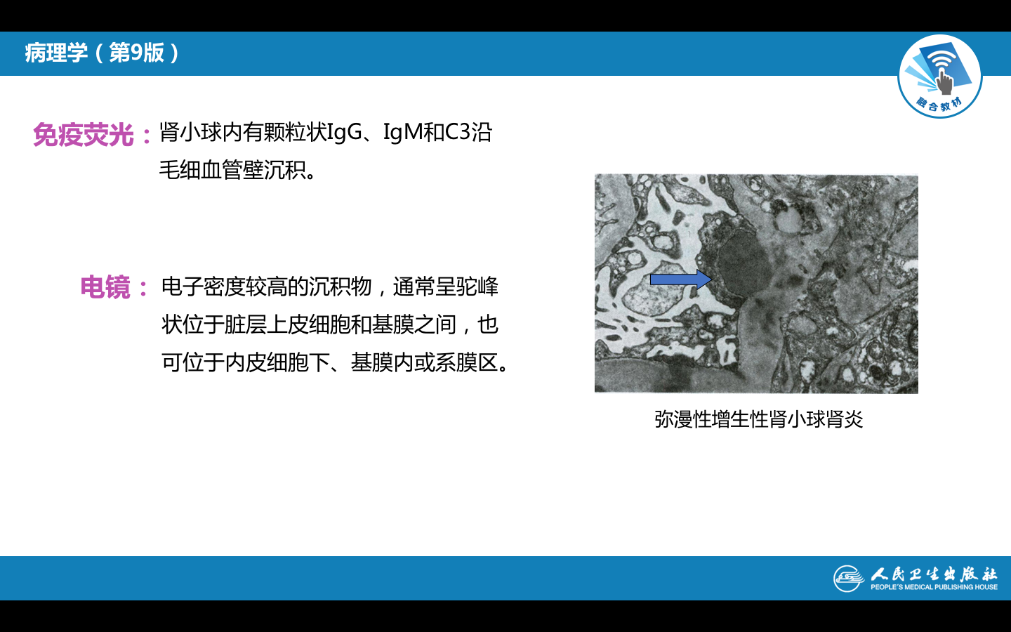 电镜下: 除证实肾小球内增生的细胞主要是系膜细胞和内皮细胞,渗出的细胞是中性粒细胞等外,可见基底膜外侧或上皮下有高密度、大团块电子致密物沉积。沉积物从基底膜向外侧形成驼峰状突起(hump)。