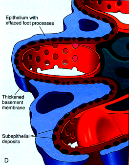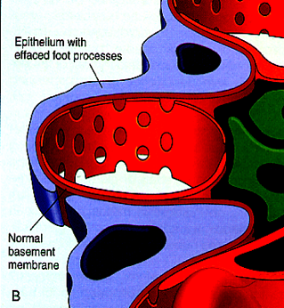 基底膜严重损伤,通透性明显增高,大量血浆蛋白(包括大分子蛋白)由肾小球滤过,引起严重的非选择性蛋白尿,表现为肾病综合征。约半数患者发病后十年左右进展至慢性肾功能衰竭