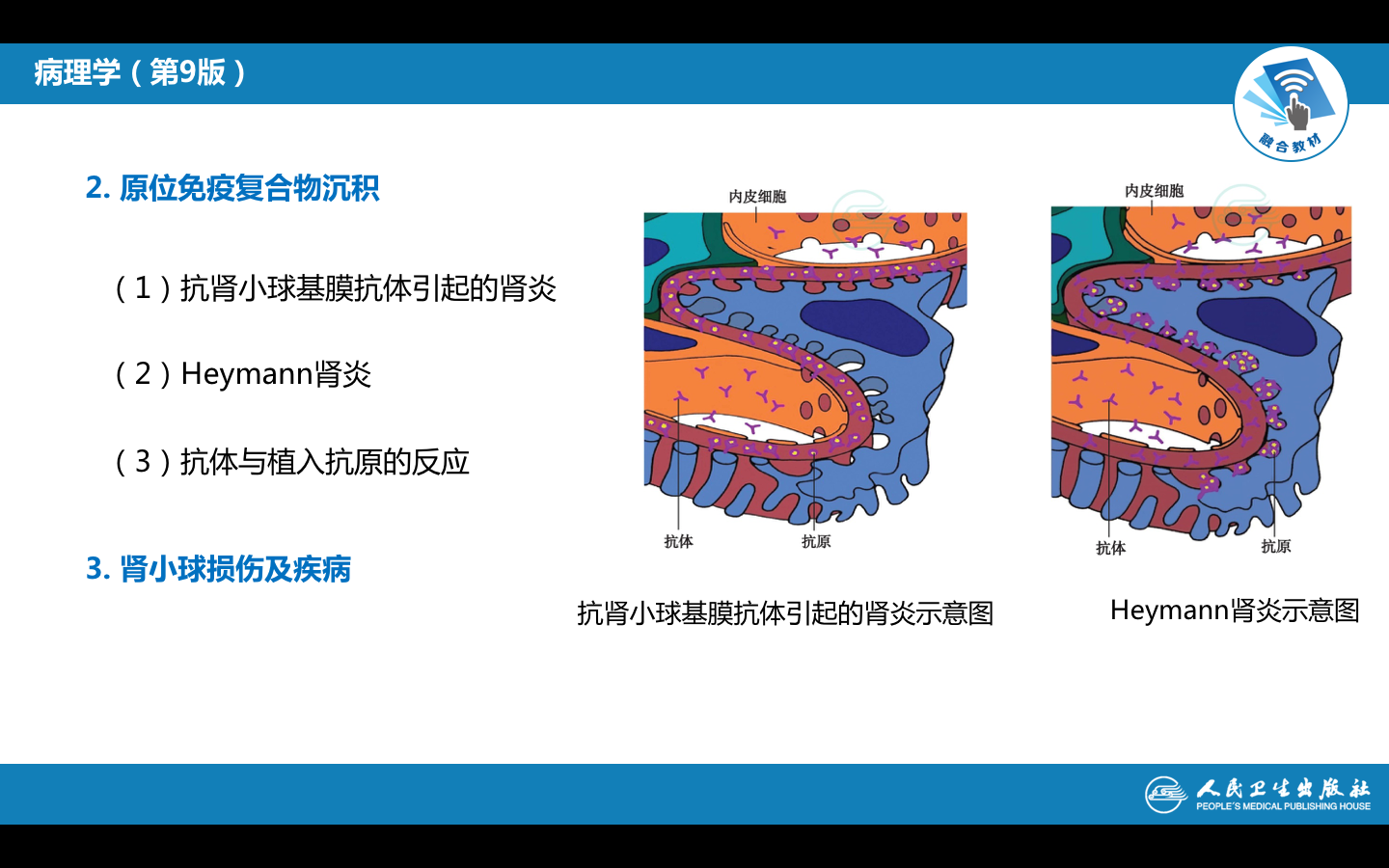 (2)植入性抗原 非肾小球抗原进入机体,首先与肾小球某一固有成分结合,形成植入抗原,刺激机体产生相应抗体,抗原抗体在肾小球内原位结合形成免疫复合物引起损伤,引起肾小球肾炎。可引起肾小球肾炎的植入性抗原有:免疫球蛋白、细菌、病毒和寄生虫等感染的产物和某些药物等。