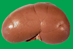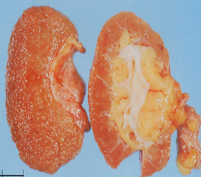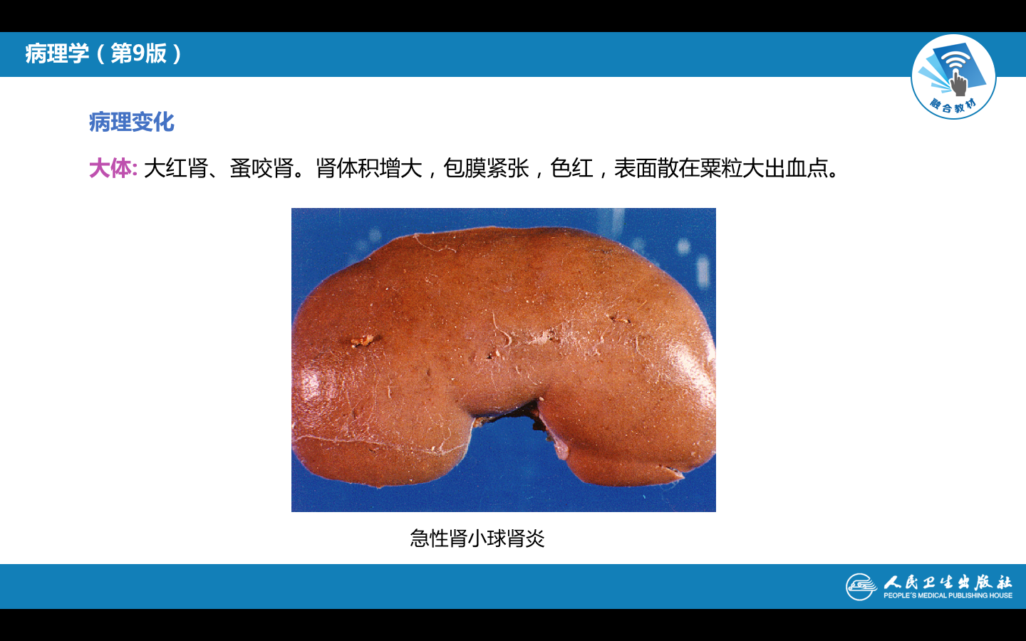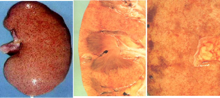 肉眼观察: 肾脏肿大,充血、被膜紧张、表面光滑、色较红,故称大红肾。