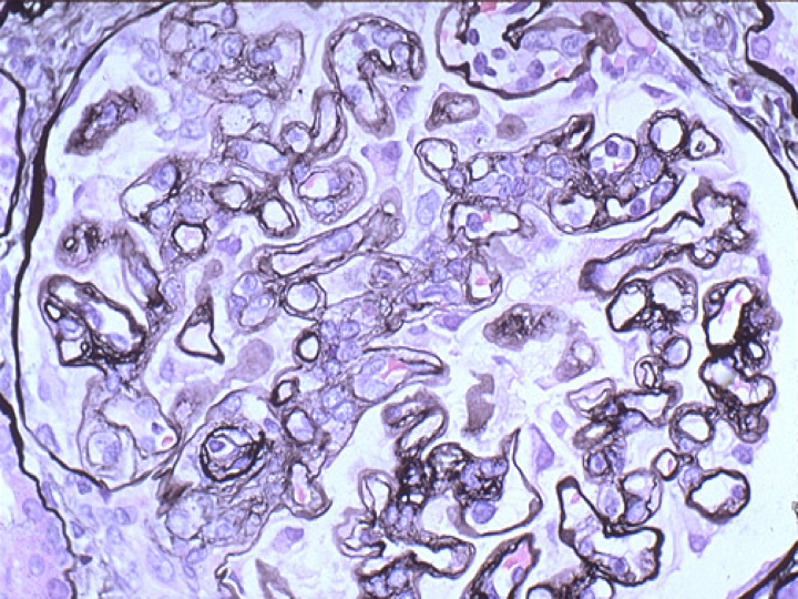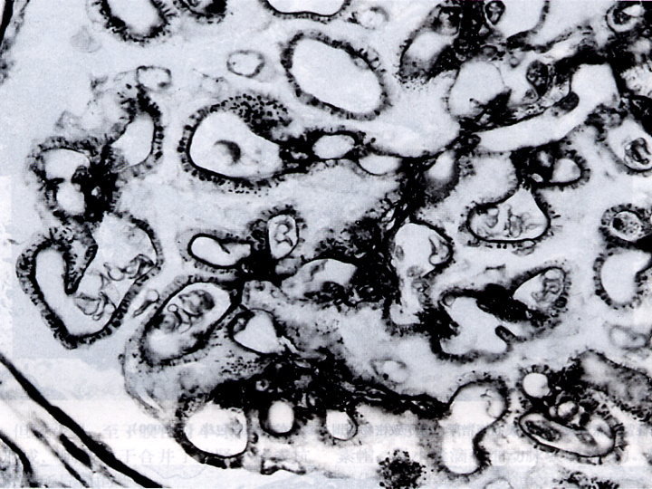光镜下,Ⅰ型典型的病变是,弥漫性系膜细胞和系膜基质重度增生,沿内皮细胞和基底膜之间长入或插入(mesangial interposition),使毛细血管壁增厚,镀银染色或PAS染色基底膜呈双层(double contour)或多层状改变,这是由于系膜基质插入造成的。由于系膜细胞和系膜基质重度增生,系膜区域扩大导致肾小球呈明显的分叶状。Ⅱ型膜增生性肾小球肾炎也呈现这些病变,但与Ⅰ型相比,系膜增生轻,肾小球分叶状结构不明显。