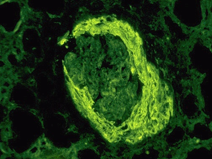 免疫荧光 Ⅰ型和Ⅳ型新月体性肾小球肾炎显示IgG和C3沿肾小球毛细血管壁呈线状沉积;Ⅱ型新月体性肾小球肾炎可见不同的免疫球蛋白和C3在肾小球不同部位沉积;Ⅲ型和Ⅴ型新月体性肾小球肾炎IgG和C3阴性。