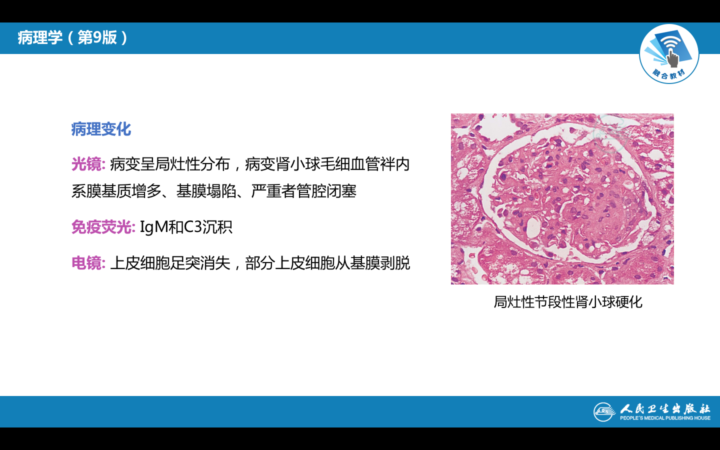 光镜下:部分肾小球,特别是位于皮髓质交界处的肾小球呈节段性玻璃样硬化,即PAS阳性物质沉积。有时可见硬化区周围上皮细胞增生并与肾小囊粘连。