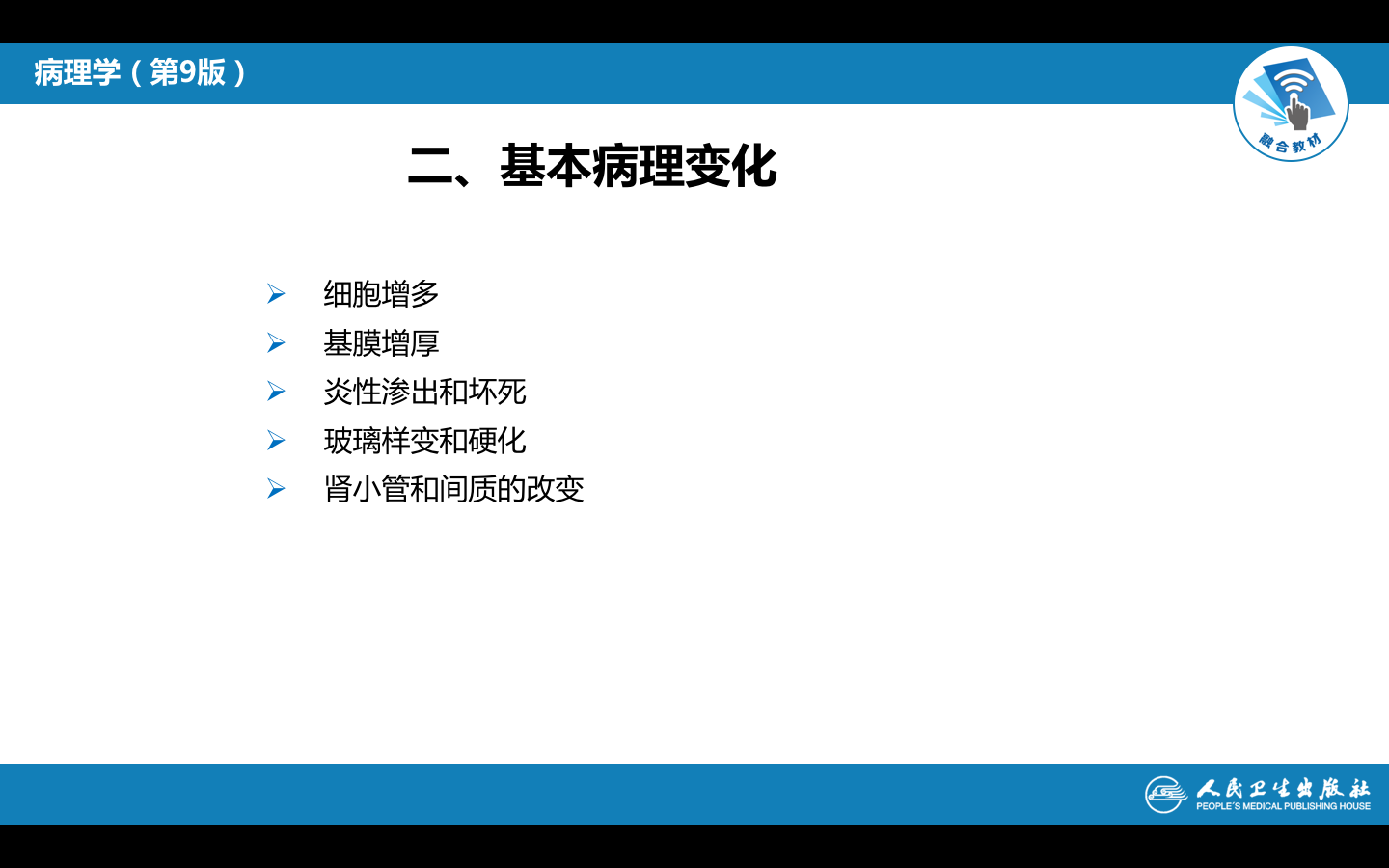 1. 变质性变化 肾小球肾炎时,由于各种蛋白溶解酶和细胞因子的作用,导致基底膜通透性增加,肾小球固有细胞变性,乃至纤维素样坏死。