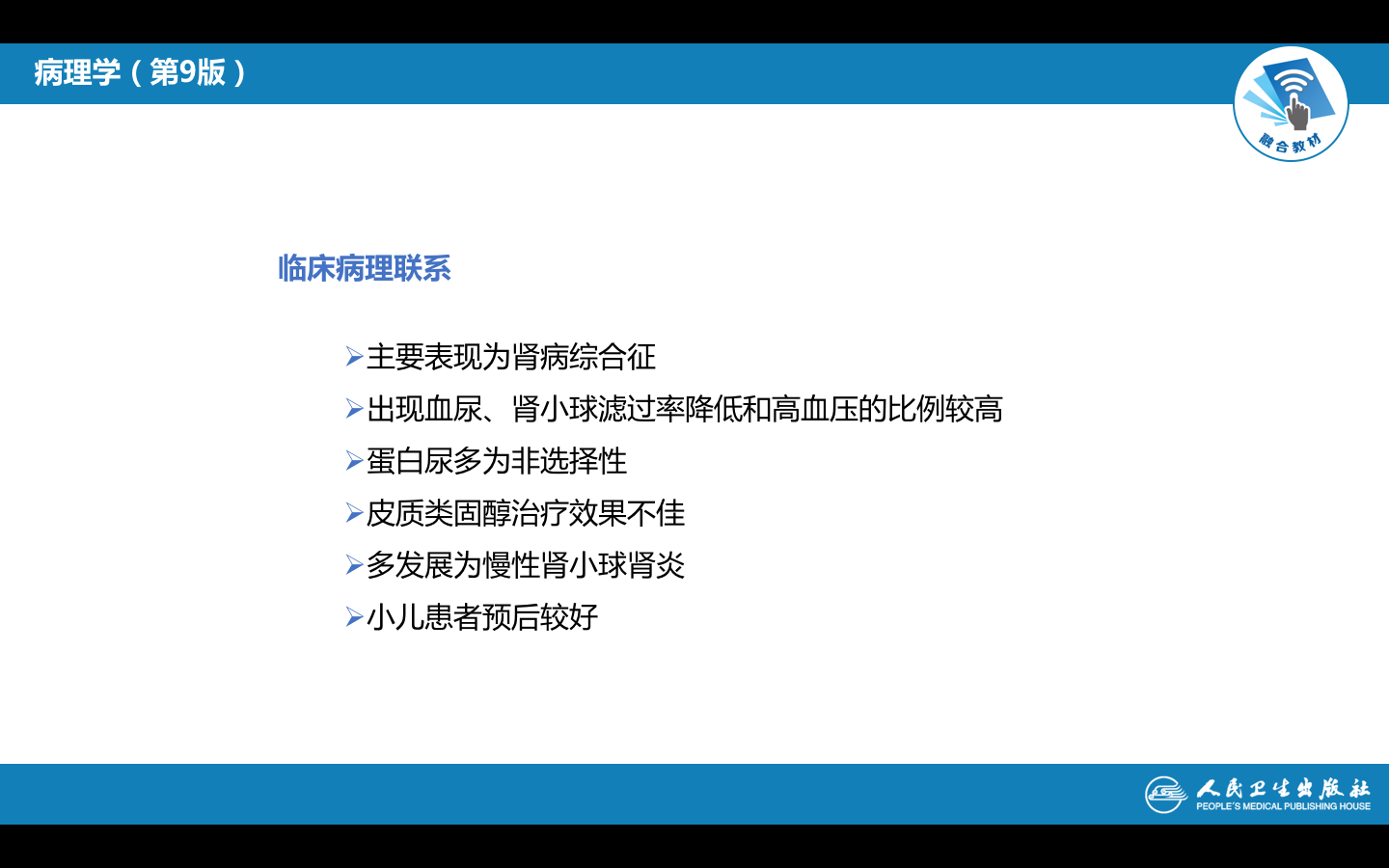 (2)临床表现与预后 :临床上表现为肾病综合征。蛋白尿发生认为与肾小球基底膜所带的负电荷减少有关。负电荷减少有利于带负电荷的血浆蛋白通过毛细血管壁漏出。肾小球无明显炎症,病变轻微,故一般无血尿及高血压,肾功能无损害。糖皮质激素治疗效果好。