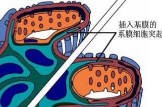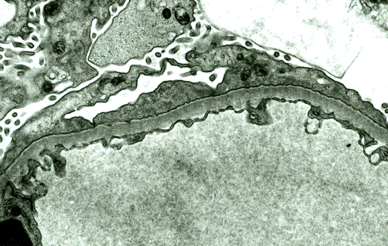 电镜下系膜细胞和系膜基质增生伴系膜插入,即增生的系膜细胞和系膜基质插入到基底膜和内皮细胞之间。系膜基质和基底膜形态相似,因而看上去似有两层或多层基底膜,这就是光镜下所见的双层或多层的形态,一层是原有基底膜,另几层是插入到内皮细胞和基底膜之间的系膜基质。肾小球内可见电子致密物。Ⅰ型 大量电子致密物位于基底膜内皮侧及系膜区域,少量见于上皮下;Ⅱ型 电子致密物的电子密度较Ⅰ型明显高,沿基底膜致密层呈带状分布。